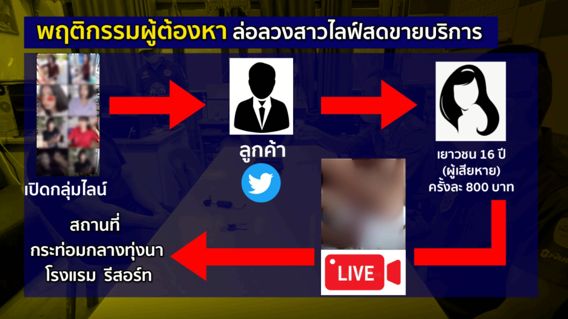 ชุดปฏิบัติการปราบปรามการค้ามนุษย์ สภ.เมืองอุบลราชธานี และพัฒนาสังคมและความมั่นคงของมนุษย์ บุกช่วยหญิงสาววัย 16 ปี ถูกบังคับขายบริการไลฟ์สดผ่านทางแอปลิเคชันไลน์ 5-10 คนต่อวัน รายได้หลักหมื่น จับกุมนายศักดิ์ ชายอายุ 37 ปี ภายในห้องพักโรงแรมแห่งหนึ่ง ต.ในเมือง อ.เมืองอุบลราชธานี พร้อมของกลางแบงก์พัน 1 ใบ และโทรศัพท์มือถือ 1 เครื่อง หลังนำเยาวชนหญิง 16 ปีมาขายบริการให้กับสายลับซึ่งเป็นการล่อซื้อ พบว่าแอบใช้สถานที่ทั่วไปทั้งกระท่อมกลางทุ่งนา โรงแรม รีสอร์ท หรืออาคารในพื้นที่ในเขต อ.วารินชำราบ โดยตั้งกลุ่มไลน์ขึ้นมาเริ่มแรกหาลูกค้าตามทวิตเตอร์ก่อนดึงเข้ากลุ่มไลน์ การไลฟ์สดขณะมีเพศสัมพันธ์เป็นการเรียกลูกค้า เพิ่งทำ 2 เดือน ล่าสุดชุดปฏิบัติการป้องกันปราบปรามการค้ามนุษย์ฯ รับตัวสาววัย 16 ไปคุ้มครองกรณีเหยื่อจากการค้ามนุษย์ที่เซฟเฮาส์แห่งหนึ่ง
