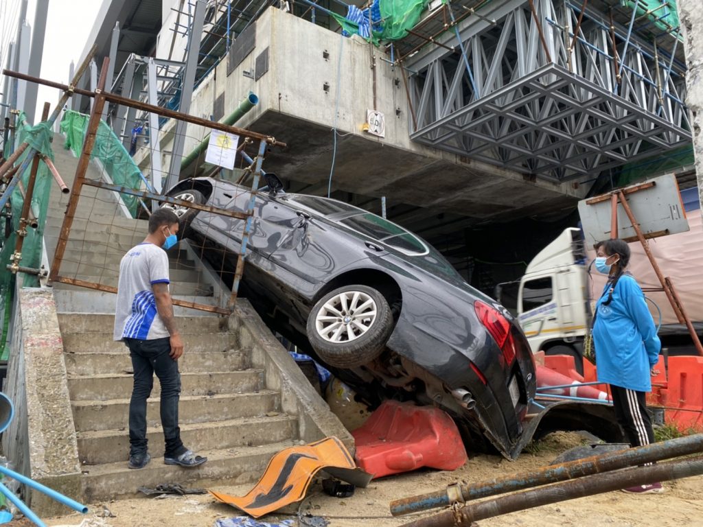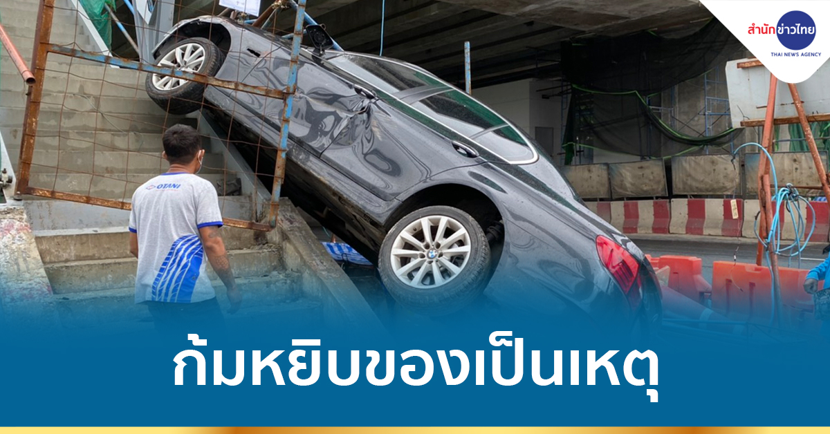 กทม. 17 ต.ค.-หนุ่มใหญ่ขับรถ BMW ก้มหยิบของ เงยหน้าอีกทีรถเสียหลักพุ่งเสยทางขึ้น-ลงบันได สถานีรถไฟฟ้าบีทีเอส ลาดปลาเค้า