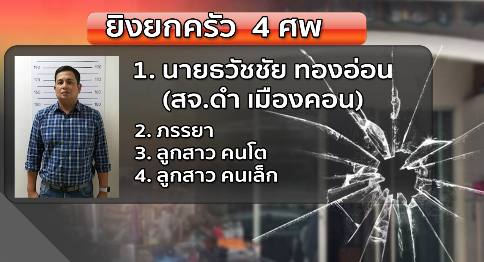 ความคืบหน้ากรณีการพบศพผู้เสียชีวิต 4 ศพ ภายในทาวน์โฮมของหมู่บ้านแห่งหนึ่งย่านกรุงเทพกรีฑา ประกอบด้วยนายธวัชชัย ทองอ่อน อายุ 48 ปี หรือ “ส.จ.ดำ” ของจังหวัดนครศรีธรรมราช เจ้าของร้านอาหารแห่งหนึ่งย่านหลังรามคำแหง, นางพัชรณัฏฐ์ สังข์ประไพ ภรรยา และลูกสาวอีก 2 ศพ ซึ่งคาดว่านายธวัชชัย ก่อเหตุยิงคนในครอบครัวทั้ง 3 คน ก่อนยิงตัวเองเสียชีวิต