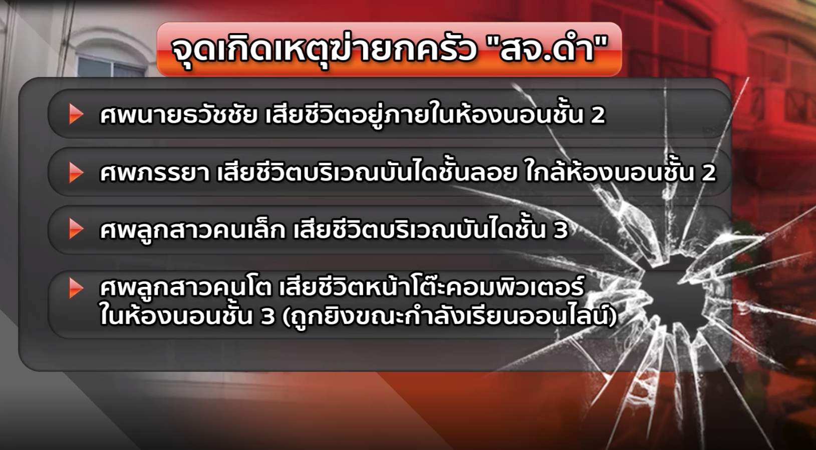สำหรับเหตุการณ์ดังกล่าวเกิดขึ้นเมื่อวานนี้ (10 พ.ย.) มีรายงานว่าเจ้าหน้าที่พบศพของนายธวัชชัยเสียชีวิตอยู่ภายในห้องนอนชั้น 2 ศพของนางพัชรณัฏฐ์ เสียชีวิตอยู่บริเวณบันไดชั้นลอย ใกล้ห้องนอนชั้น 2 ศพของลูกสาวคนเล็ก เสียชีวิตอยู่บริเวณบันไดชั้น 3 และศพของลูกสาวคนโต เสียชีวิตอยู่หน้าโต๊ะคอมพิวเตอร์ ภายในห้องนอนชั้น 3 โดยพบว่าถูกยิงขณะกำลังเรียนออนไลน์