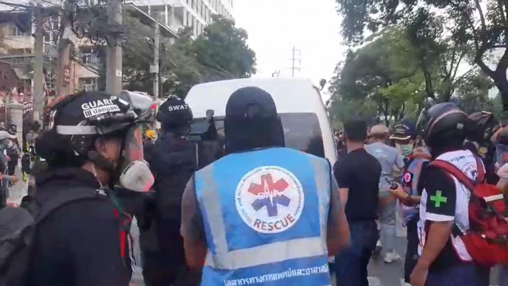 กทม. 14 พ.ย.-กลุ่มผู้ชุมนุมปะทะกับ คฝ. หน้าสถาบันนิติเวชวิทยา มีคนได้รับบาดเจ็บ 1 ราย ถูกอาวุธไม่ทราบชนิด นำส่งโรงพยาบาล ก่อนที่ผู้ชุมนุมจะเคลื่อนต่อไปยังสถานทูตเยอรมนี