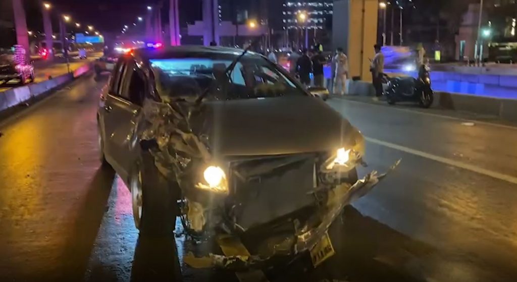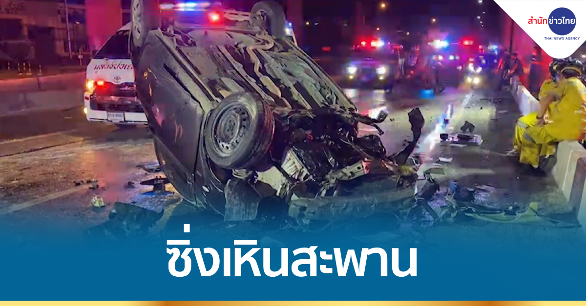 กรุงเทพฯ 16 พ.ย.-รถเก๋งชนกันบนเชิงสะพานข้ามแยกลาดพร้าว ดับ 1 คาดสาเหตุมาเร็ว ช่วงขึ้นสะพานเกิดเสียหลัก