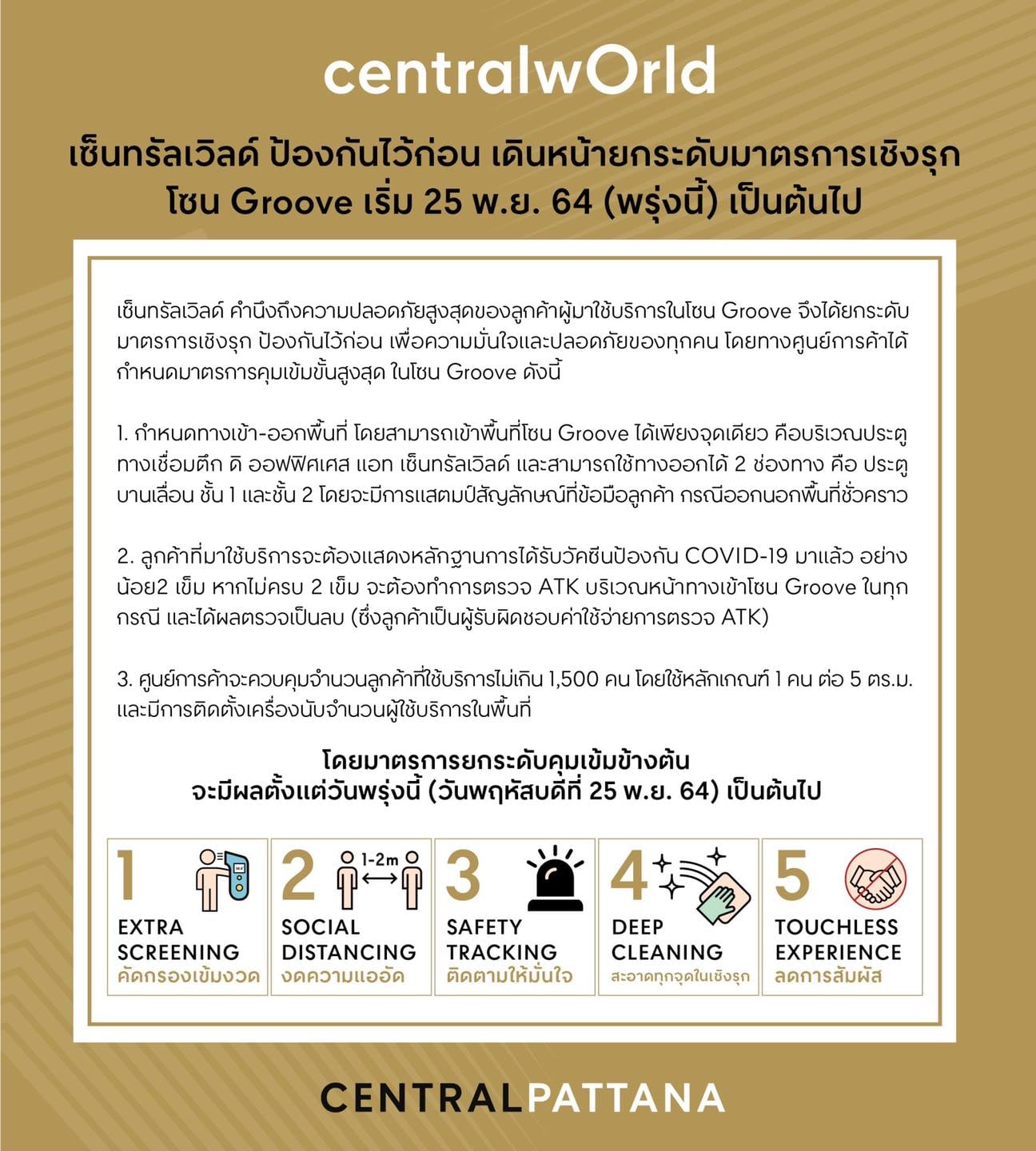 ด้าน “ศูนย์การค้าเซ็นทรัลเวิลด์” ได้โพสต์ข้อความลงในเฟซบุ๊ก CentralWorld ชี้แจงข่าวลือที่เกิดขึ้นของโซน Groove กรณีพบผู้ติดเชื้อโควิด-19 ระบุทางศูนย์การค้าไม่ได้นิ่งนอนใจ และอยู่ระหว่างการตรวจสอบข้อเท็จจริงโดยละเอียดจากหน่วยงานภาครัฐที่เกี่ยวข้อง และไม่มีการแจ้งเกี่ยวกับผู้ติดเชื้อแต่อย่างใดจากหน่วยงานที่เกี่ยวข้อง โดยผลการตรวจ ATK ของพนักงานร้านค้าทุกร้าน ในรอบ 7 วันที่ผ่านมา ยังไม่พบผู้ติดเชื้อแต่อย่างใด หากมีความคืบหน้า ทางศูนย์การค้าจะแจ้งให้ทราบต่อไป. – สำนักข่าวไทย