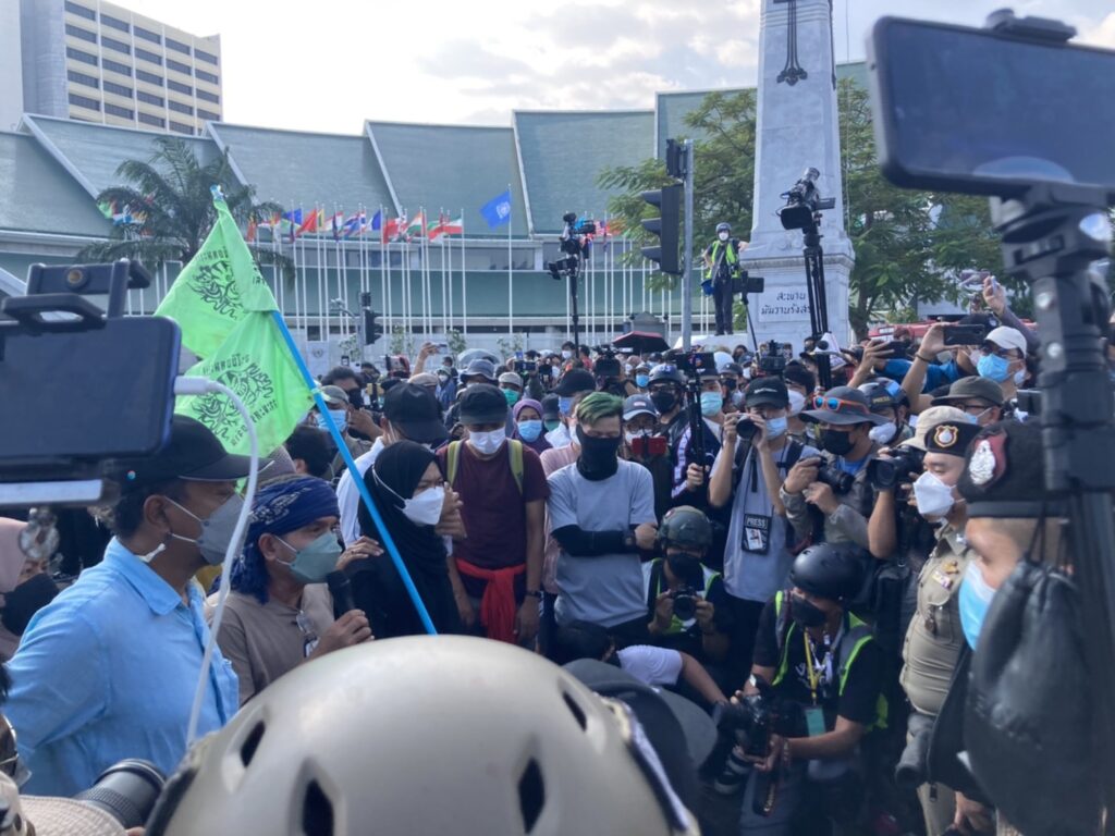ผู้ชุมนุมกลุ่มเครือข่ายจะนะรักษ์ถิ่นและเครือข่ายแนวร่วมภาคประชาสังคม เคลื่อนขบวนออกจากด้านหน้าองค์การสหประชาชาติ ถนนราชดำเนิน มุ่งหน้าทำเนียบรัฐบาล ก่อนประชิดแนวตำรวจควบคุมฝูงชนที่ตั้งแถวขวางขบวนที่เชิงสะพานมัฆวานรังสรรค์