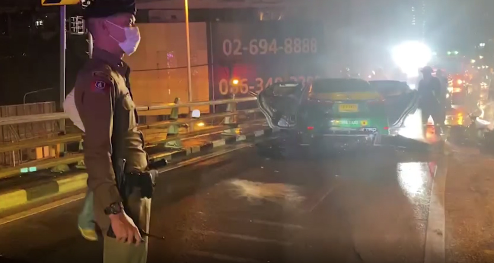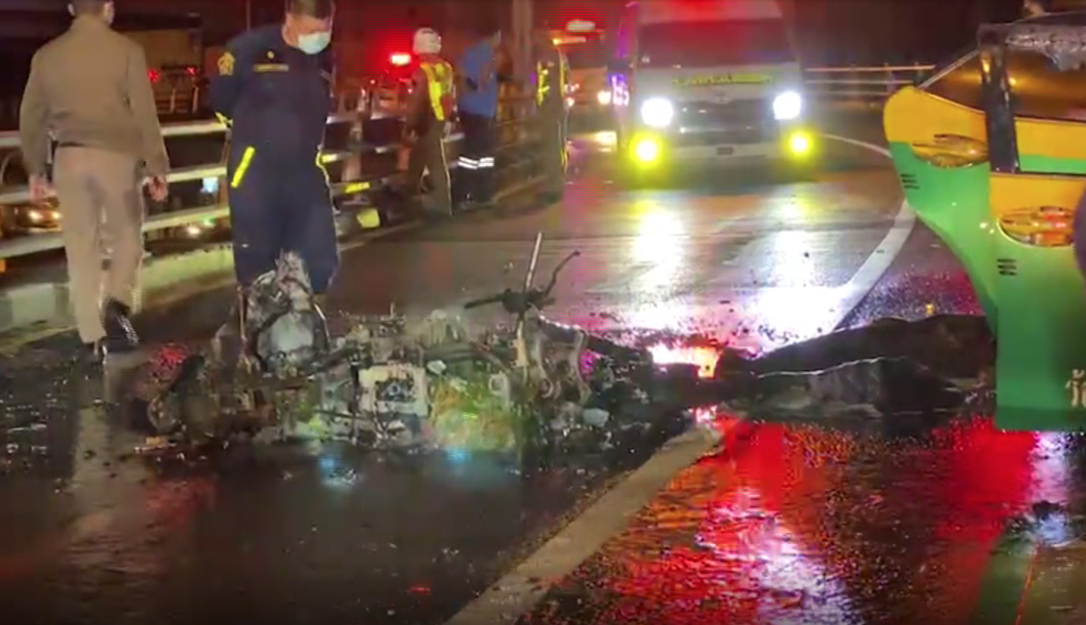 เจ้าหน้าที่ดับเพลิงฉีดน้ำดับเพลิงที่ลุกไหม้รถแท็กซี่สีเขียวเหลือง หลังชนเข้ากับรถจักรยานยนต์บิ๊กไบค์ยี่ห้อ ducati หมายเลขทะเบียน6 กศ 5008 กรุงเทพมหานคร ที่ขี่ย้อนศรขึ้นมาบนสะพานข้ามแยกสามเหลี่ยมดินแดง จนเกิดเพลิงไหม้ไฟลุกท่วม บริเวณกระโปรงหน้ารถไปจนถึงบริเวณห้องโดยสาร ขณะที่จักรยานยนต์บิ๊กไบค์ไฟลุกไหม้ทั้งคันเช่นกัน ใช้เวลาประมาณ 15 นาที จึงควบคุมเพลิงได้ ห่างไปประมาณ 5 เมตร พบร่างนายอัฐพล อายุ 29 ปี คนขี่รถจักรยานยนต์รับบาดเจ็บสาหัส กู้ชีพนำส่งโรงพยาบาลราชวิถี ส่วนผู้หญิงที่นั่งซ้อนท้ายมาบาดเจ็บที่หน้าอก ถูกนำตัวส่งโรงพยาบาลเปาโล โชคชัยสี่ ที่เกิดเหตุยังพบกีต้าร์ไฟฟ้าตกอยู่ ทราบว่าเป็นของนายอัฐพล คนขี่รถจักรยานยนต์ ที่เลิกจากเล่นดนตรี กลับบ้านย่านประชาสงเคราะห์ ส่วนคนขับรถแท็กซี่และผู้โดยสารไม่มีผู้ได้รับบาดเจ็บ แต่อยู่ในความตกใจ โดยเล่าว่าขณะกำลังไปส่งผู้โดยสารที่สถานีรถไฟหัวลําโพง ใช้สะพานข้ามแยกสามเหลี่ยมดินแดง ขณะถึงกลางสะพาน พบรถจักรยานยนต์ขี่สวนทางขึ้นมา ทำให้ชนประสานงาเข้าอย่างจัง และชนลากรถจักรยานยนต์ไปกว่า 20 เมตร จนเกิดไฟลุกไหม้รถจักรยานยนต์ ก่อนจะลุกลามมาที่รถแท็กซี่ของตนเอง จึงรีบลงจากรถพร้อมผู้โดยสาร และประสานให้เจ้าหน้าที่ดับเพลิงและเจ้าหน้าที่ตำรวจมาตรวจสอบที่เกิดเหตุ