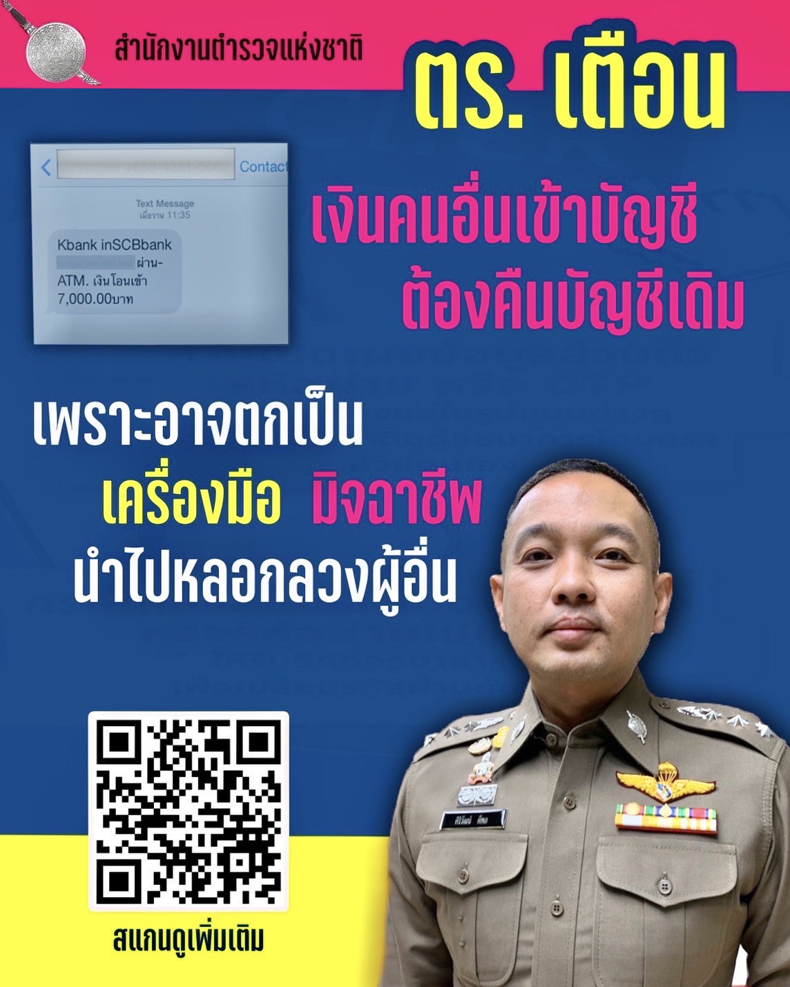 สำนักงานตำรวจแห่งชาติ จึงขอประชาสัมพันธ์พี่น้องประชาชน ถึงวิธีในการป้องกันไม่ให้ตกเป็นเหยื่อของคนร้ายหลอกใช้บัญชี โดยหากพบว่ามีเงินไม่ทราบที่มาถูกโอนเข้ามายังบัญชีธนาคารของท่าน ให้ท่านไปที่สถานีตำรวจใกล้บ้านเพื่อลงบันทึกประจำวันไว้เป็นหลักฐาน ว่ามีเงินไม่ทราบที่มาถูกโอนมาให้ท่านและท่านไม่มีส่วนเกี่ยวข้องกับเงินดังกล่าว และหากมีผู้มาติดต่อขอเงินคืนอ้างว่าโอนเงินผิดบัญชี ท่านจะต้องคืนเงินไปยังบัญชีธนาคารเดิมที่ทำการโอนมาเท่านั้น ห้ามโอนกลับไปให้บัญชีผู้อื่นโดยเด็ดขาด หรือหากจะคืนเป็นเงินสดควรนัดหมายไปคืนที่สถานีตำรวจต่อหน้าพนักงานสอบสวน เพื่อป้องกันไม่ให้คนร้ายนำบัญชีธนาคารของท่านไปใช้ในการฉ้อโกงผู้อื่น และหากท่านได้รับความเสียหายจากการถูกหลอกใช้บัญชีธนาคาร สามารถแจ้งเบาะแสไปยังสายด่วน 191 และสายด่วนสำนักงานตำรวจแห่งชาติ 1599 ได้ตลอด 24 ชั่วโมง.-สำนักข่าวไทย