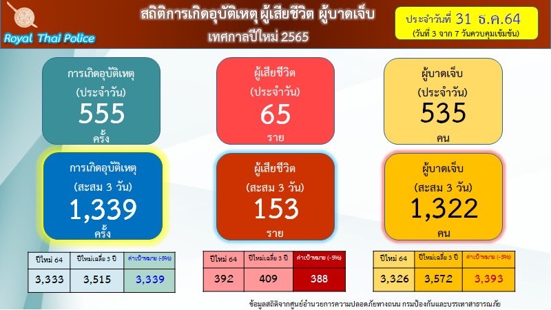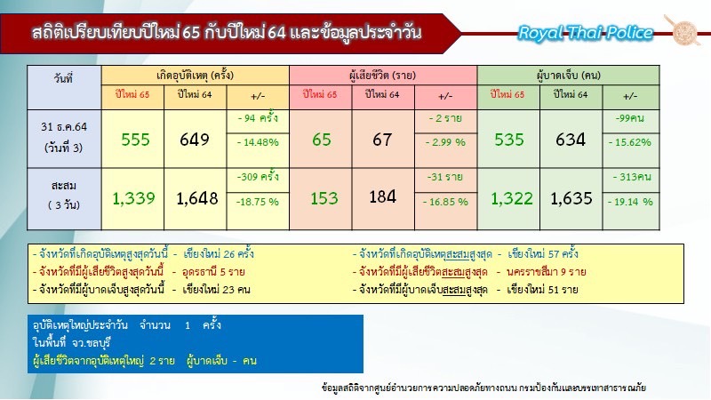 1.การเกิดอุบัติเหตุ 3 วันแรกของเทศกาลปีใหม่ 2565 เกิดจำนวน 1,339 ครั้ง ลดลงจากช่วงเวลาเดียวกันของปีใหม่ปีที่แล้ว จำนวน 309 ครั้ง (ลดลง 18.75%)