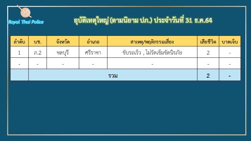 2.จำนวนผู้เสียชีวิต 3 วันแรกของเทศกาลปีใหม่ 2565 จำนวน 153 ราย ลดลงจากช่วงเวลาเดียวกันของปีใหม่ปีที่แล้ว จำนวน 31 ราย (ลดลง 16.85%)