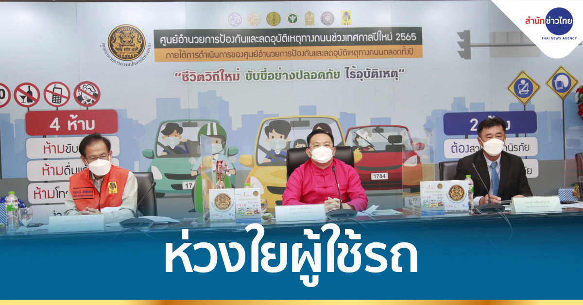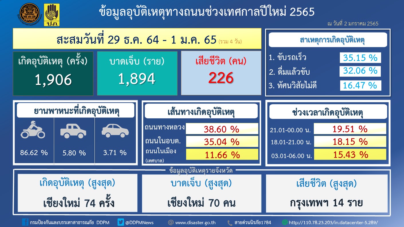 นายนิรัตน์ พงษ์สิทธิถาวร รองปลัดกระทรวงมหาดไทย หัวหน้ากลุ่มภารกิจด้านสาธารณภัยและพัฒนาเมือง ในฐานะประธานการประชุมคณะอนุกรรมการเฉพาะกิจศูนย์อำนวยการป้องกันและลดอุบัติเหตุทางถนนตลอดทั้งปี เผยว่าศูนย์อำนวยการป้องกันและลดอุบัติเหตุทางถนนช่วงเทศกาลปีใหม่ พ.ศ. 2565 โดยกรมป้องกันและบรรเทาสาธารณภัยและความร่วมมือของหน่วยงานภาคีเครือข่าย รวบรวมสถิติอุบัติเหตุทางถนนประจำวันที่ 1 มกราคม 2565 ซึ่งเป็นวันที่ 4 ของการรณรงค์ “ชีวิตวิถีใหม่ ขับขี่อย่างปลอดภัย ไร้อุบัติเหตุ” เกิดอุบัติเหตุ 574 ครั้ง ผู้เสียชีวิต 73 ราย ผู้บาดเจ็บ 574 คน สาเหตุที่ทำให้เกิดอุบัติเหตุสูงสุด ได้แก่ ดื่มแล้วขับ ร้อยละ 37.28 ขับรถเร็ว ร้อยละ 35.71 ยานพาหนะที่เกิดอุบัติเหตุสูงสุด ได้แก่ รถจักรยานยนต์ ร้อยละ 89.27 ส่วนใหญ่เกิดบนเส้นทางตรง ร้อยละ 81 ถนนกรมทางหลวง ร้อยละ 37.80 ช่วงเวลาที่เกิดอุบัติเหตุสูงสุด ได้แก่ ช่วงเวลา 03.01 – 06.00 น. ร้อยละ 25.96 ผู้บาดเจ็บและเสียชีวิตสูงสุด อยู่ในช่วงอายุ 30 – 39 ปี ร้อยละ 17