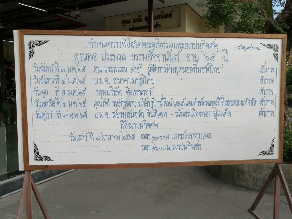 สำหรับกำหนดการสวดพระอภิธรรมศพ คุณพ่อประมวล ธรรมสัจจานันท์ มีกำหนดสวดพระอภิธรรม เป็นเวลา 5 คืน โดยคืนนี้เป็นคืนแรก และสวดต่อเนื่องจนถึงวันที่ 7 ม.ค.65 ก่อนทำการฌาปนกิจ ในวันที่ 8 ม.ค.65 เวลา 16.00 น.