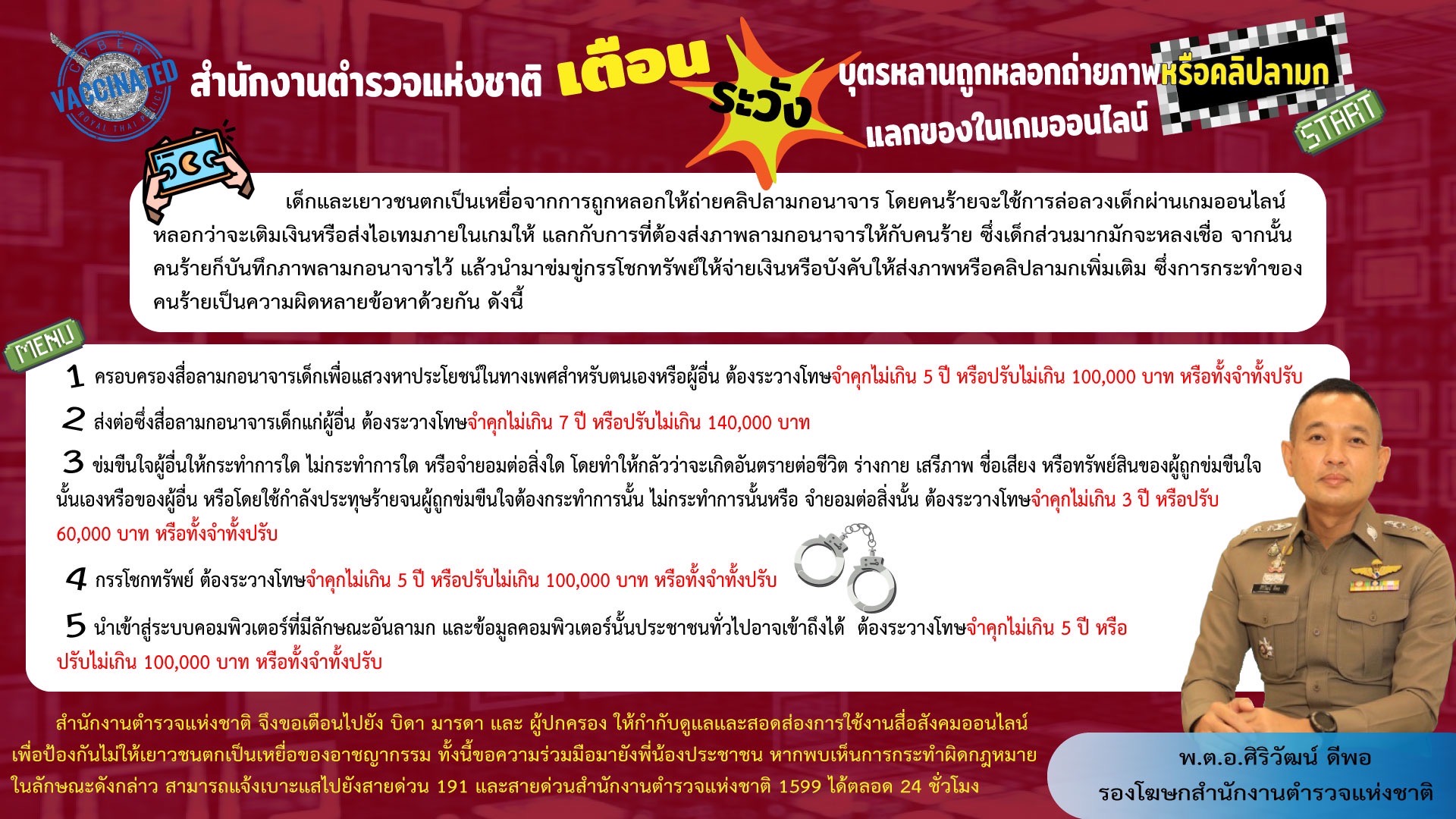 สตช.5 ม.ค.-พ.ต.อ.ศิริวัฒน์ ดีพอ รองโฆษกสำนักงานตำรวจแห่งชาติ กล่าวว่า ปัจจุบัน พบว่าเด็กและเยาวชนหลงเชื่อและตกเป็นเหยื่อจากการถูกหลอกให้ถ่ายคลิปลามกอนาจารเป็นจำนวนมาก โดยคนร้ายจะใช้วิธีการล่อลวงเด็กผ่านเกมออนไลน์ หลอกว่าจะเติมเงินหรือส่งไอเทมภายในเกมส์ให้ เพื่อแลกกับการที่ต้องส่งภาพลามกอนาจารให้กับคนร้าย ซึ่งเด็กส่วนมากมักหลงเชื่อและส่งภาพลามกอนาจารเพื่อแลกกับของในเกมส์ จากนั้นคนร้ายก็บันทึกภาพลามกอนาจารไว้ แล้วนำมาข่มขู่กรรโชกทรัพย์ โดยให้เด็กจ่ายเงินหรือบังคับให้ส่งภาพหรือคลิปลามกเพิ่มเติม มิฉะนั้นจะเผยแพร่ภาพของเหยื่อในสื่อสังคมออนไลน์หรือขู่ว่าจะส่งไปให้ครูอาจารย์ หรือบุคคลที่เด็กรู้จัก ทำให้เด็กเกิดความหวาดกลัวและยอมทำตามคนร้าย