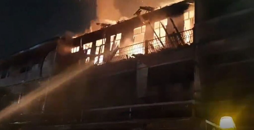 ที่เกิดเหตุเป็นอาคารพาณิย์สูง 3 ชั้น เป็นอาคารครึ่งไม้ครึ่งปูน ปลูกติดกันหลายหลัง โดยต้นเพลิงมาจากชั้น 1 ของอาคารเลขที่ 911 ซึ่งเป็นสถานที่เก็บวัสดุอุปกรณ์ประเภทท่อออกซิเจน ก่อนที่เพลิงจะลามยังไปยังชั้น 2 และชั้น 3 และยังลามไปยังอาคารใกล้เคียงอย่างรวดเร็ว เจ้าหน้าที่ได้ระดมฉีดน้ำสกัดเพลิงนานกว่า 25 นาที เพลิงจึงสงบ