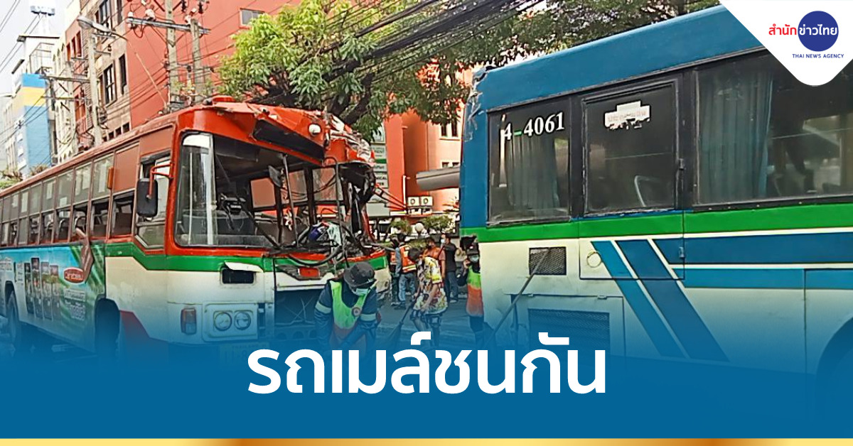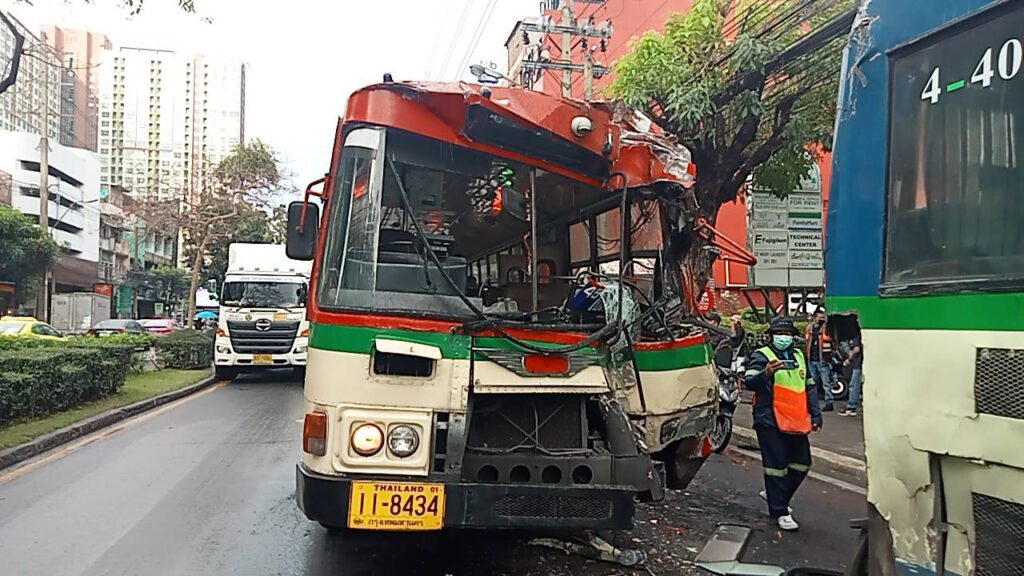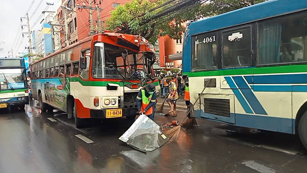 เมื่อเวลา 09.10 น. วันนี้ มีรายงานว่าขณะมีฝนตกลงมาอย่างหนักได้เกิดอุบัติเหตุรถเมล์ชนกันที่บริเวณป้ายรถประจำทางใกล้แยกกล้วยน้ำไท 300 เมตร ฝั่งมุ่งหน้าถนนสุขุมวิท ถนนพระราม 4 แขวงพระโขนง เขตคลองเตย