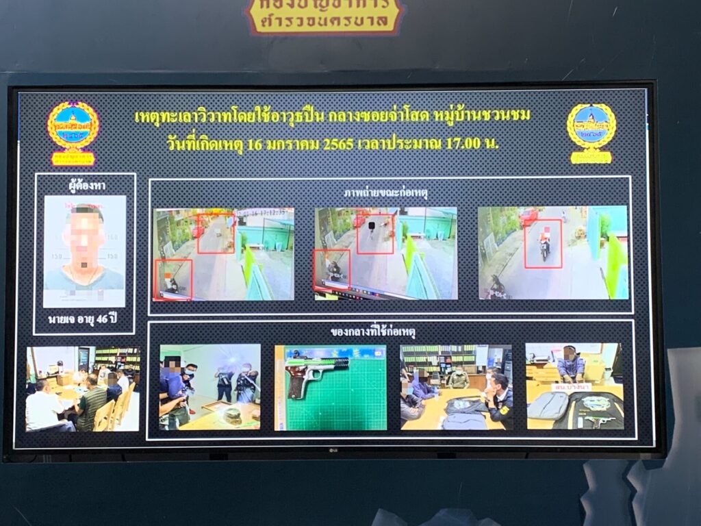 กรุงเทพฯ 24 ม.ค. – พล.ต.ท.สำราญ นวลมา ผบช.น.แถลงการจับกุมนายธนาเดช สิริรักษาธรรม อายุ 46 ปี ข้อหาพยายามฆ่าผู้อื่น, มีอาวุธปืนในครอบครองโดยไม่ได้รับใบอนุญาตจากนายทะเบียนฯ ตามหมายจับศาลอาญาพระโขนง พร้อมของกลางอาวุธปืน ยี่ห้อนอริงโก้ ขนาด 9 มม.และเสื้อผ้าที่สวมใส่ในวันก่อเหตุ