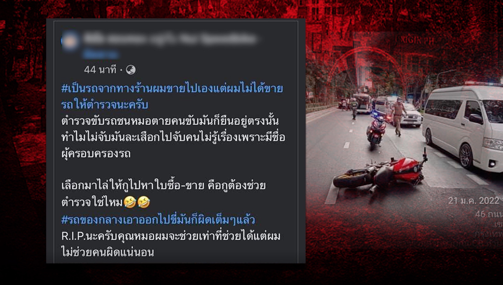 กรุงเทพฯ 25 ม.ค.- กรณี ส.ต.ต.ขี่บิ๊กไบค์พุ่งชนหมอกระต่ายเสียชีวิตขณะข้ามถนน แม้ยังไม่มีการนัดวันส่งฟ้องที่แน่ชัด และเจ้าตัวพร้อมพ่อได้ขอบวชอุทิศส่วนกุศลให้หมอกระต่าย ขณะที่หลายเพจยังออกมาแฉข้อมูลต่างๆ และตำรวจก็เร่งชี้แจงคลายปมสงสัย โดยเฉพาะเรื่องการซื้อขายรถ และการเอาผิดด้านคดีความ