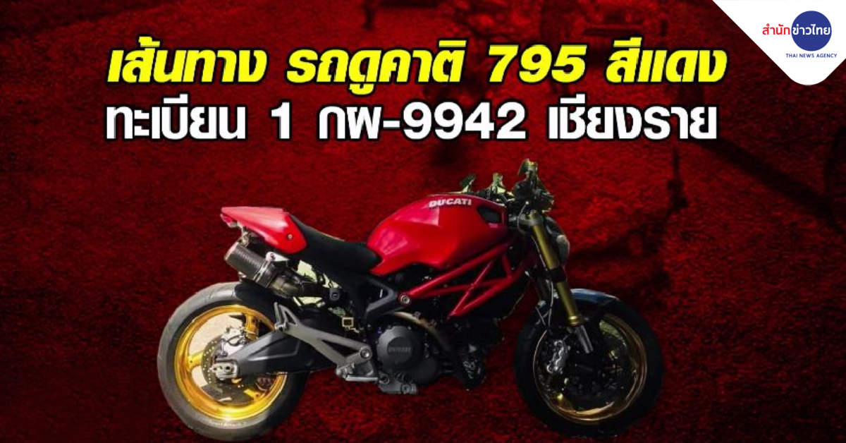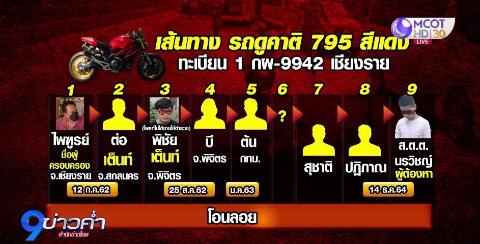 เส้นทางรถจักรยานยนต์ ดูคาติ 795 สีแดง ทะเบียน 1 กผ-9942 เชียงราย คันที่ผู้ต้องหาในคดีชน “หมอกระต่าย” เสียชีวิต ขับขี่ในวันเกิดเหตุ มีคำถามว่าเป็นรถของกลางหรือไม่ เรื่องนี้ นายพิชัย สอนทอง เจ้าของเต็นท์รถจักรยานยนต์ ซึ่งเป็นผู้ที่ออกมาโพสต์ถึงกระแสข่าวรถของกลาง เมื่อวานนี้ (25 ม.ค.) ก่อนจะลบโพสต์ไป และเป็นผู้หนึ่งที่อยู่ในเส้นทางการซื้อขายรถ “ดูคาติ” คันนี้ ให้สัมภาษณ์กับสำนักข่าวไทย ชี้แจงถึงที่มาของรถคันดังกล่าว โดยระบุว่า รถคันนี้ผ่านมือมาแล้วอย่างน้อย 8 มือ และทั้งหมดเป็นการโอนลอย. – สำนักข่าวไทย