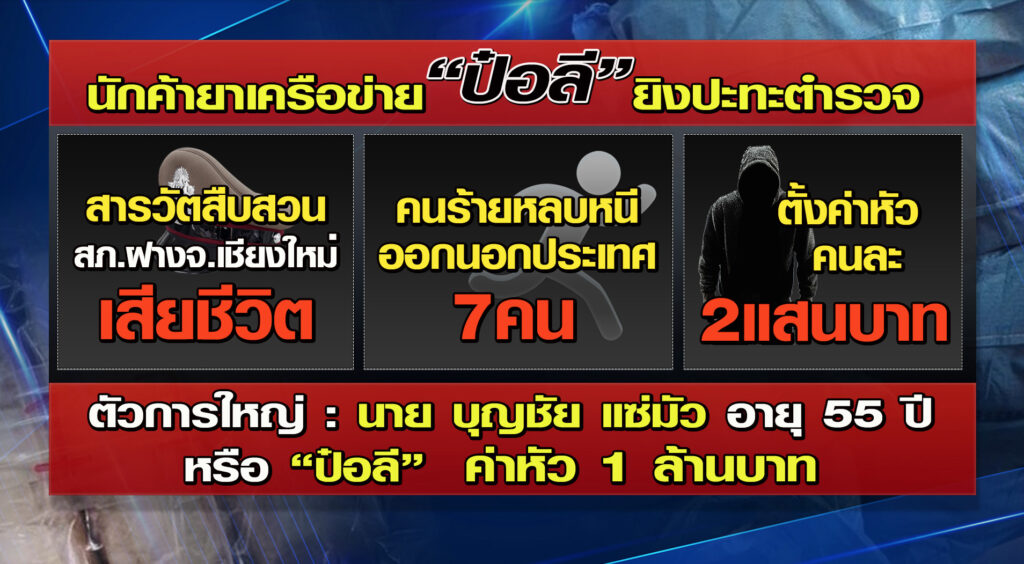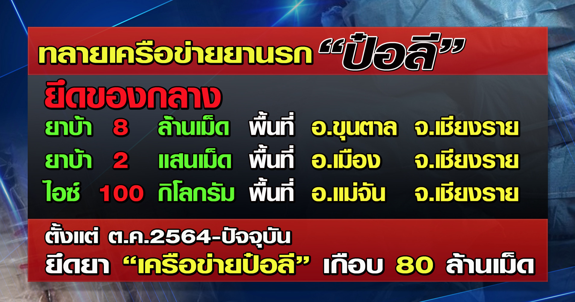 เชียงใหม่ 25 ม.ค.- ตำรวจภาค 5 จับยาบ้ากว่า 8 ล้านเม็ด ไอซ์ 100 กก. โดยเฉพาะปีนี้จับยาบ้าเครือข่ายป๋อลี ได้มากกว่า 10 ครั้ง จำนวนกว่า 40 ล้านเม็ด พร้อมตั้งค่าหัวป๋อลี สูงถึง 1 ล้านบาท แต่ยังหลบหนีอยู่ตามแนวชายแดนในลาว และยังตั้งค่าหัวขบวนการค้ายาเสพติด 7 คน ที่ยิงสารวัตรสืบสวน สภ.ฝาง เสียชีวิต รายละ 2 แสนบาท