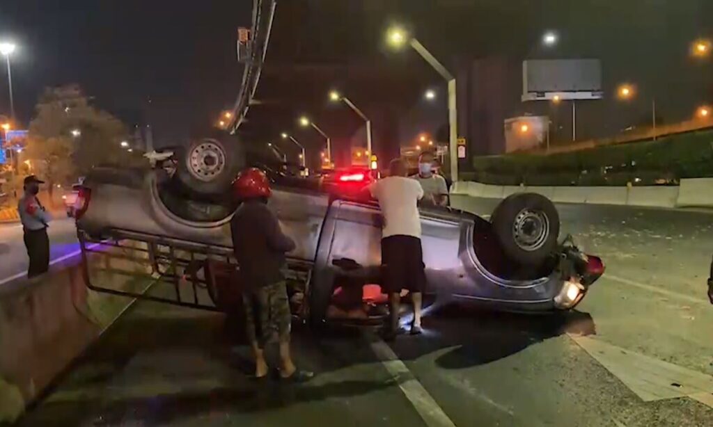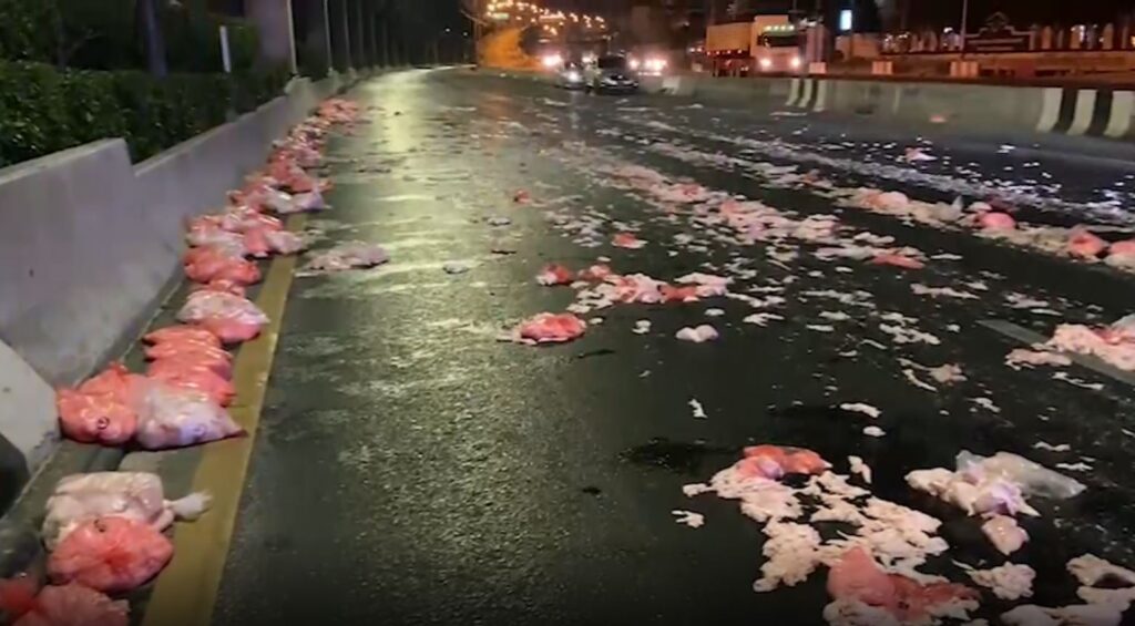 นายสุรเชษฐ์ มโนสาร คนขับรถกระบะขนไก่ ซึ่งยืนรอในที่เกิดเหตุ เล่าว่า ช่วงเวลาประมาณ 01.00 น. ตนเองขับรถขนไก่ออกมาจากบ้านย่านรังสิต เพื่อนำไปส่งให้กับโรงงานลูกชิ้นย่านปากน้ำ จังหวัดสมุทรปราการ โดยใช้ความเร็วประมาณ 100 กิโลเมตรต่อชั่วโมง แต่เมื่อขับมาถึงจุดเกิดเหตุ ก่อนถึงต่างระดับรัชวิภา ยางล้อหลังซ้ายแตก ทำให้รถเสียหลักพุ่งชนแบริเออร์เกาะกลางถนน พลิกตะแคงไถลเป็นทางยาวประมาณ 100 เมตร เนื้อไก่ หนังไก่ และอกไก่ที่ขนมา กระจายเกลื่อนถนน โชคดีที่ขณะเกิดอุบัติเหตุ ไม่ไปชนซ้ำกับรถคันอื่น