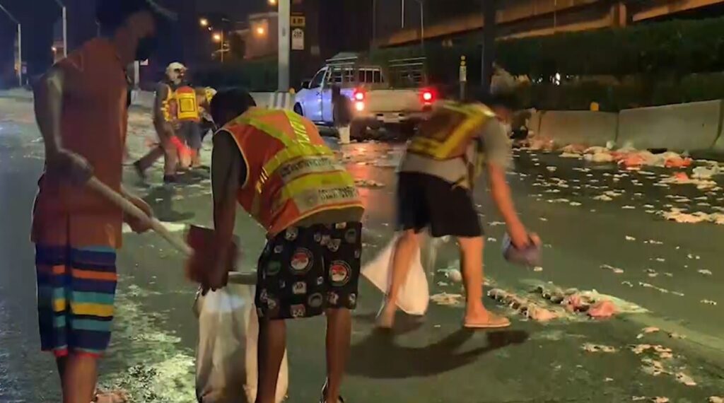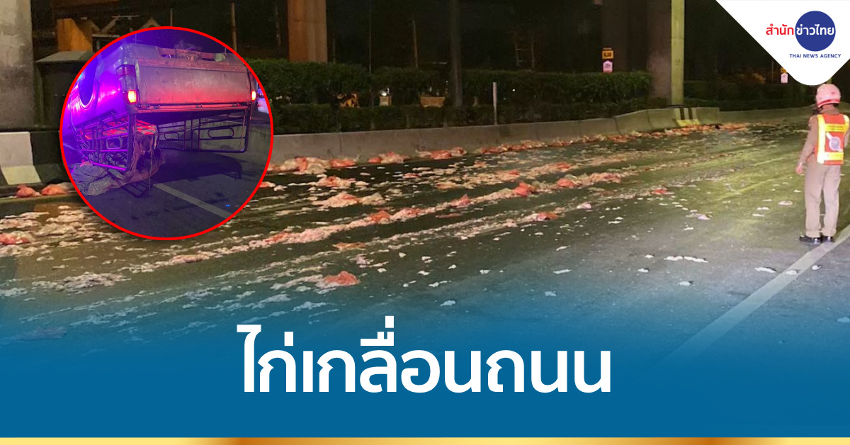 กรุงเทพฯ 26 ม.ค.-รถกระบะยางแตก พลิกคว่ำบนถนนวิภาวดี-รังสิต ไก่สดที่บรรทุกมากว่า 2,300 กิโลกรัม กระจายเกลื่อนถนน เร่งทำความสะอาด เกรงอุบัติเหตุซ้ำซ้อน