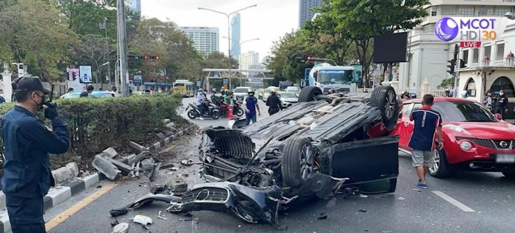 ที่เกิดเหตุอยู่บริเวณด้านหน้าประตูทางเข้า-ออกจุฬาลงกรณ์มหาวิทยาลัย ฝั่งถนนพญาไทขาออก พบรถเบนซ์สีดำพลิกคว่ำอยู่กลางถนน ล้อชี้ฟ้า กันชนด้านหน้าพังเสียหายอย่างหนัก โดยมีนายภูริ อายุ 21 ปี เป็นคนขับ ได้รับบาดเจ็บเล็กน้อย ใกล้กันพบรถเก๋งยี่ห้อฮอนด้าสีขาวพลิกคว่ำล้อชี้ฟ้า สภาพด้านหน้าถูกชนจนพังยับ มีนางกระจ่างศรี อายุ 49 ปี เป็นคนขับ ได้รับบาดเจ็บที่ศีรษะ และผู้โดยสารที่อยู่ในรถคันดังกล่าวอีก 1 คน คือ นายสัภยา อายุ 47 ปี ได้รับบาดเจ็บเล็กน้อย ทั้งหมดถูกนำตัวส่งโรงพยาบาลจุฬาฯ