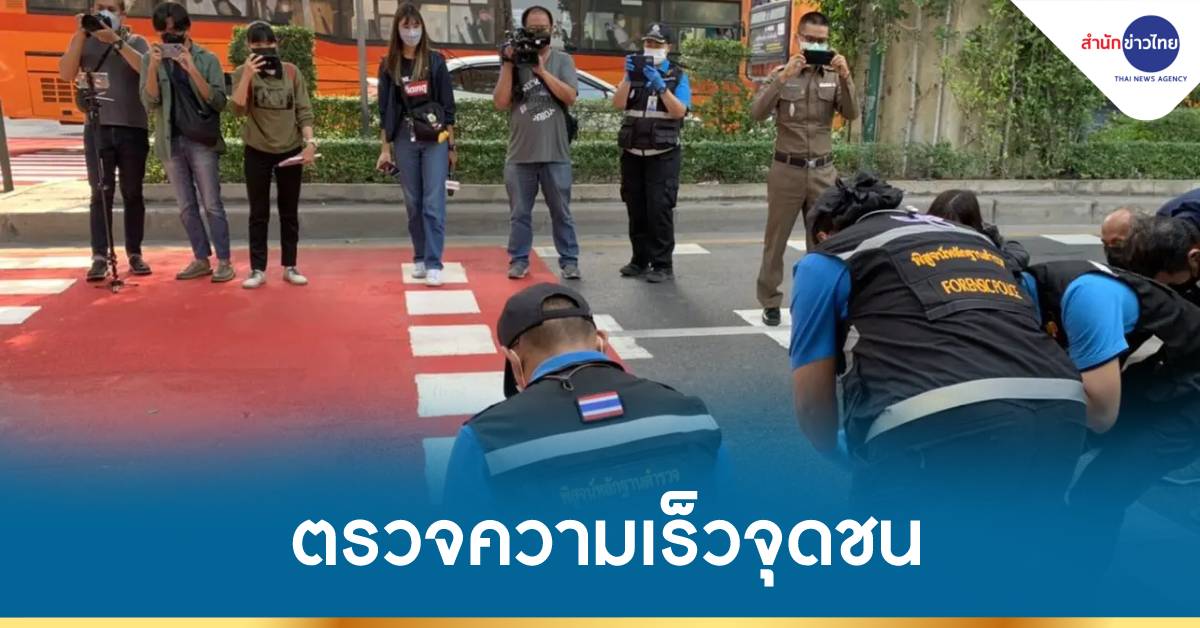 พญาไท 28 ม.ค.-ตํารวจกองพิสูจน์หลักฐานกลางลงพื้นที่ตรวจสอบทางม้าลาย หน้า รพ.สถาบันโรคไตภูมิราชนครินทร์ เพื่อรวบรวมพยานหลักฐานความเร็วและข้อมูลทางเทคนิคนำไปประกอบสำนวนคดี