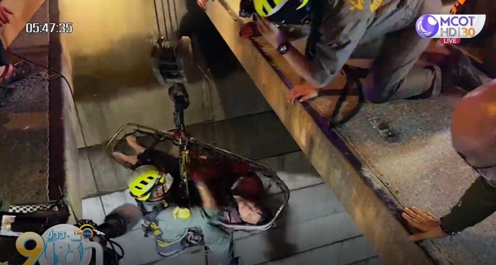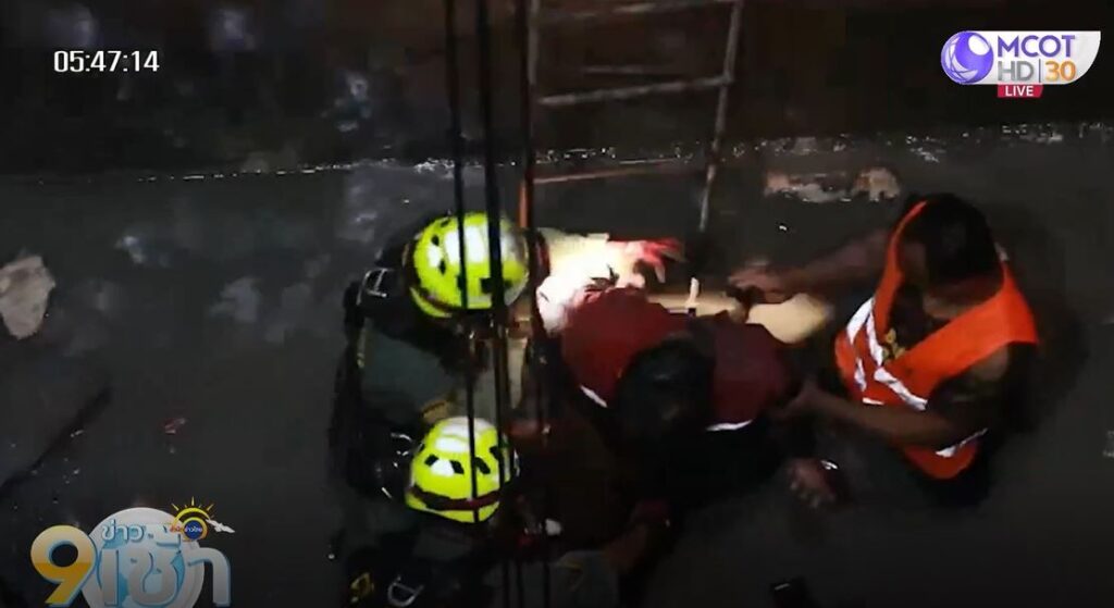 เจ้าหน้าที่ผู้รับเหมารีบให้การช่วยเหลือ ก่อนเจ้าหน้าที่กู้ชีพเข้ามาให้การช่วยเหลือ โดยใช้รถเครนยนต์สายสลิงลงไปนำร่างผู้ได้รับบาดเจ็บขึ้นมาด้านบน ก่อนเจ้าหน้าที่จะรีบนำส่งโรงพยาบาล ทราบชื่อภายหลังคือ นายฐมทัศน์ อายุ 28 ปี
