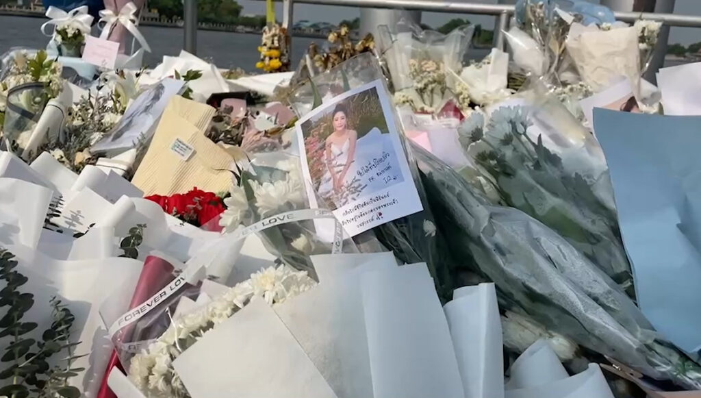 ที่ท่าเรือพิบูลสงคราม 1 อ.เมืองนนทบุรี ตลอดทั้งคืนที่ผ่านมาจนกระทั่งถึงช่วงสายของวันนี้ (5 มี.ค.) แฟนคลับ “แตงโม” ยังคงทยอยเดินทางมาวางช่อดอกไม้กันอย่างต่อเนื่อง จะสังเกตเห็นได้ว่า ช่อดอกไม้ที่บริเวณโป๊ะเรือมีจำนวนเพิ่มขึ้นมาก บางคนนำรูปถ่าย “แตงโม” พร้อมข้อความแสดงความอาลัยติดช่อดอกไม้มาด้วย นอกจากนี้ก็ยังมีข้อความอีกหลายข้อความ ล้วนแต่เป็นข้อความที่แสดงถึงความรักและความอาลัยต่อ “แตงโม” ทั้งสิ้น
