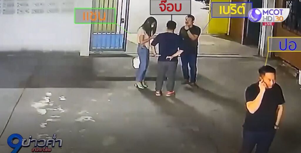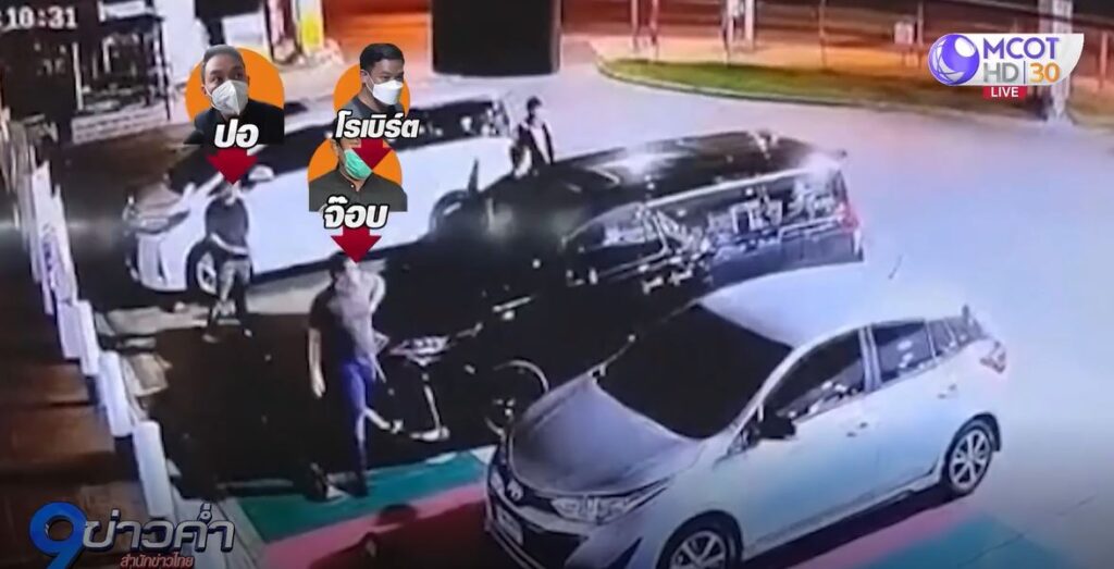 ส่วนภาพวงจรปิดที่เห็นล่าสุดเป็นภาพวันที่ 25 ก.พ. เวลา 02.01 น. ปรากฏรถอัลพาร์ดสีดำของนายปอขับเข้ามาจอดบริเวณลานจอดของปั๊ม จากนั้นรถอัลพาร์ดสีขาวของนายโรเบิร์ตตามมา และมีรถเก๋งโตโยต้ายาริสสีบรอนซ์ มาจอดเป็นคันที่ 3 ซึ่งมีนายจ๊อบเดินลงมาจากรถ จากนั้นอัลพาร์ดสีขาวของแซนก็ขับเข้ามาจอดเรียงกัน