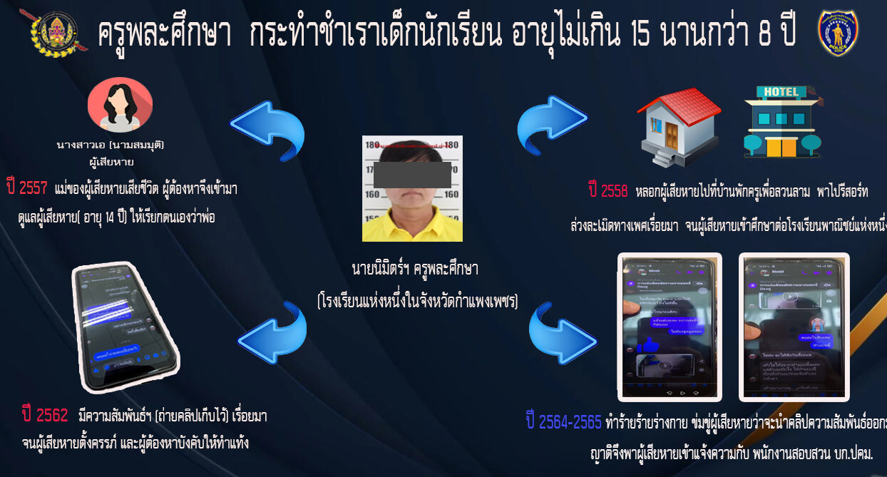 ชายคนดังกล่าวเป็นครูสอนพละของโรงเรียนแห่งหนึ่งในจังหวัดกำแพงเพชร ก่อเหตุข่มขืนนักเรียนหญิงอายุ 13 ปี และถ่ายคลิปขณะมีเพศสัมพันธ์ เอาไว้เพื่อข่มขู่ ซึ่งครูพละคนนี้เข้ามาดูแลเด็กหญิง หลังจากที่แม่เสียชีวิต และให้เด็กเรียกเขาว่าพ่อ ก่อนจะข่มขืน ตั้งแต่อายุ 13 ปี จนถึงปัจจุบัน อายุ 21 ปี รวม 8 ปี โดยใช้คลิปข่มขู่มาโดยตลอด แม้กระทั่งผู้เสียหายเรียนจบและย้ายไปอยู่กับญาติที่กรุงเทพฯ และเคยข่มขืนจนท้อง ก่อนบังคับให้ทำแท้งมาแล้ว ถึง 2 ครั้ง