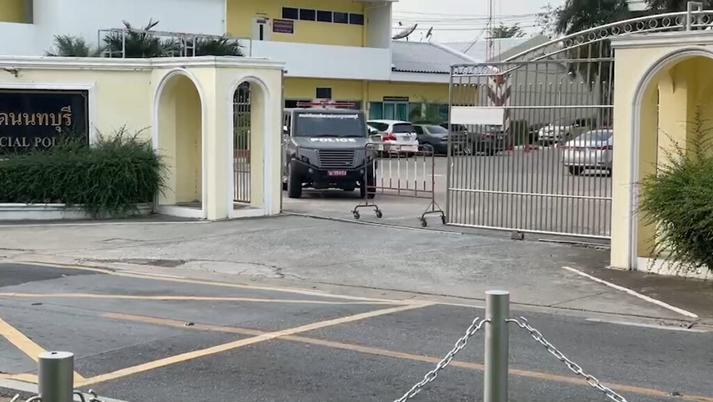 ส่วนด้านหน้าทางเข้ากองบังคับการตำรวจภูธรจังหวัดนนทบุรี ได้มีกำลังเจ้าหน้าที่ตำรวจปฏิบัติการพิเศษ (นปพ.) ยืนปิดประตูทางเข้า ไม่อนุญาตให้บุคคลภายนอกเข้าไปด้านใน.-สำนักข่าวไทย