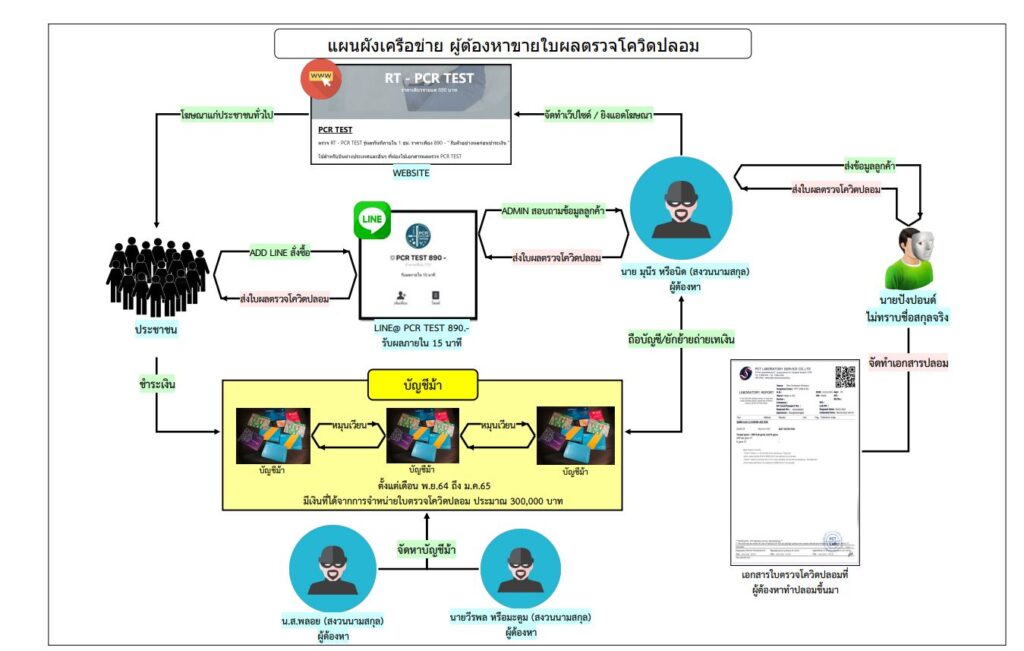 พ.ต.อ.ธรากร เลิศพรเจริญ รอง ผบก.ปคบ เปิดผยว่า ตำรวจ ปคบ.สืบสวนพบว่า เว็บไซต์ https://covid-lab.airsite.co มีการโฆษณาขายใบรับรองผลการตรวจโควิด ราคา 890 บาท รับผลภายใน 15 นาที เพียงแจ้งชื่อนามสกุล วันที่ออกใบรับรองผลการตรวจโควิด โดยผู้ตรวจไม่ต้องเดินทางไปตรวจ โดยใบรับรองจะออกในนามบริษัท พีซีที ลาบอราตอรี่ เซอร์วิส จํากัด (PCT LABORATORY SERVICE CO,.LTD.) ซึ่งจากการตรวจสอบกับบริษัทดังกล่าว พบว่าเป็นใบรับรองผลปลอม บริษัทไม่ได้เป็นผู้ออกให้ เป็นเหตุให้บริษัทได้รับความเสียหาย บริษัทจึงแจ้งความร้องทุกข์ต่อพนักงานสอบสวนเพิ่มเติม