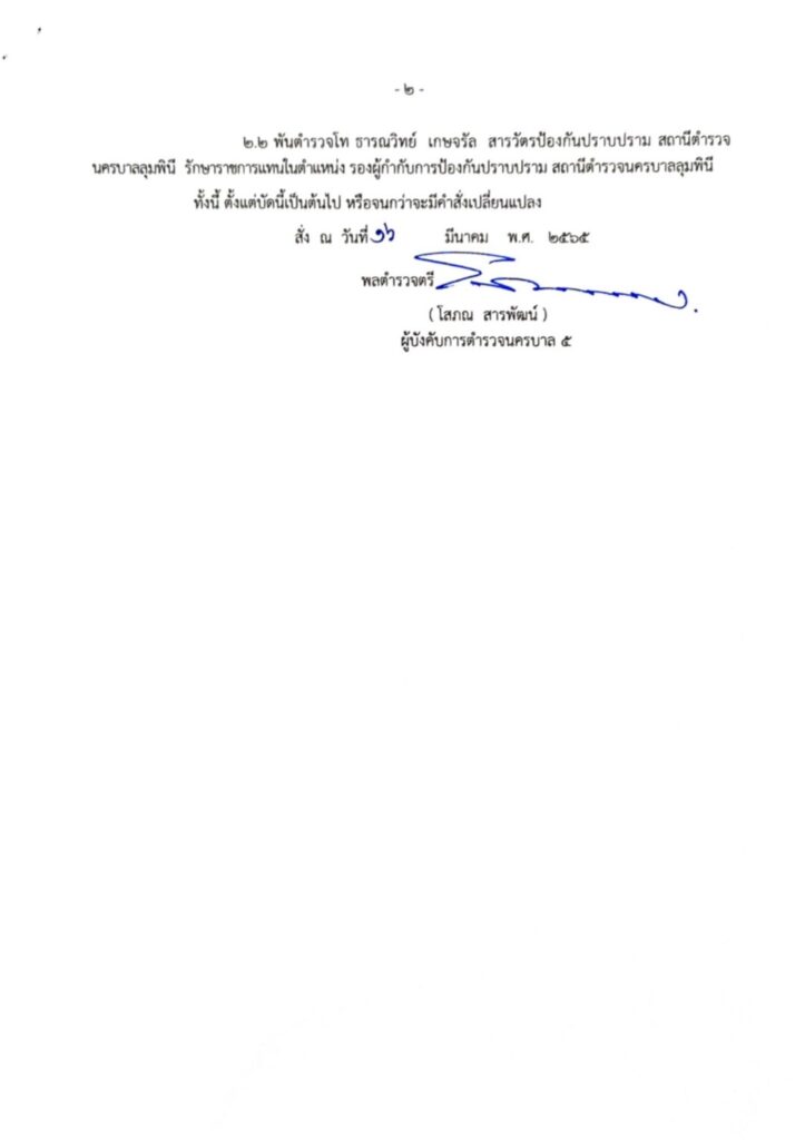 1.ให้ข้าราชการตำรวจสถานีตำรวจนครบาลลุมพินี ไปปฏิบัติราชการ ศูนย์ปฏิบัติการ กองบังคับการตำรวจนครบาล 5 (ศปก.บก.น.5) โดยขาดจากต้นสังกัดเดิม เพื่อปฏิบัติหน้าที่ตามที่ผู้บังคับการ ตำรวจนครบาล 5 มอบหมายจนกว่าจะมีคำสั่งเปลี่ยนแปลง ประกอบด้วย