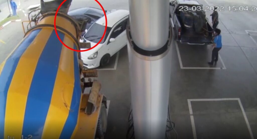 สอบถาม นายสุรชาติ แซ่ลี้ ผู้ดูแลปั๊มน้ำมัน เล่าว่า ขณะที่รถยนต์คันสีขาวจอดเติมน้ำมัน จู่ๆ รถคู่กรณีคันสีเทา เลี้ยวซ้ายเข้ามาภายในปั๊มอย่างรวดเร็ว โดยล้อรถฝั่งขวาปีนขึ้นฟุตปาธหน้าปั๊ม ก่อนจะพุ่งชนเด็กปั๊มซึ่งเป็นสาวชาวเมียนมา ที่ยืนอยู่ท้ายรถเก๋งคันสีขาวอย่างแรง ทำให้ช่วงข้อเท้าซ้ายขาด