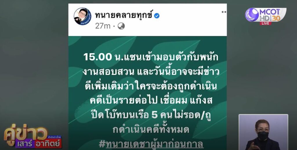ตอนนี้มีสื่อหลายช่อง รวมทั้งเพื่อนฝูงติดต่อมาเยอะมาก ว่าตนใช่กุนซือวางสคริปต์ วางแผนแนะนำให้ 5 คนบนเรือ ให้การเท็จหรือเปล่า ตนยืนยันตรงนี้ว่าไม่ใช่ตนแน่นอน ถ้ามีหลักฐานก็จัดมา จะได้ถือโอกาสชี้แจงความจริง โดยไม่ผิดมรรยาททนายความ ว่าพวกคุณมาปรึกษาอะไรตนบ้าง และตนแนะนำอะไรไป รับรองว่าเป็นข่าวดังแน่นอน.-สำนักข่าวไทย