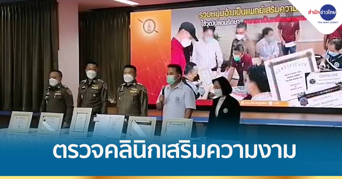 ตำรวจปราบปรามการกระทำความผิดเกี่ยวกับการคุ้มครองผู้บริโภค ร่วมกับกรมสนับสนุนบริการสุขภาพ แถลงผลตรวจค้นคลินิกเวชกรรม ย่านวังทองหลาง พร้อมควบคุมตัวแพทย์เสริมความงามที่ใช้วุฒิการศึกษาปลอม หลังมีดารานักแสดงหลงเชื่อตกเป็นเหยื่อหลายราย
