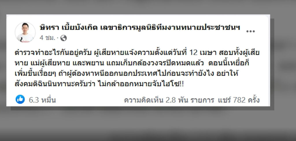 และนอกจากโพสต์ก่อนหน้านี้ ทนายษิทรา ยังโพสต์ข้อความถามถึงตำรวจว่า “ตำรวจทำอะไรกันอยู่ครับ ผู้เสียหายแจ้งความตั้งแต่วันที่ 12 เมษา สอบทั้งผู้เสียหาย แม่ผู้เสียหาย และพยาน แถมเก็บกล้องวงจรปิดหมดแล้ว ตอนนี้เหยื่อก็เพิ่มขึ้นเรื่อยๆ ถ้าผู้ต้องหาหนีออกนอกประเทศไปก่อนจะทำยังไง อย่าให้สังคมติฉินนินทานะครับว่า ไม่กล้าออกหมายจับไฮโซ!!”