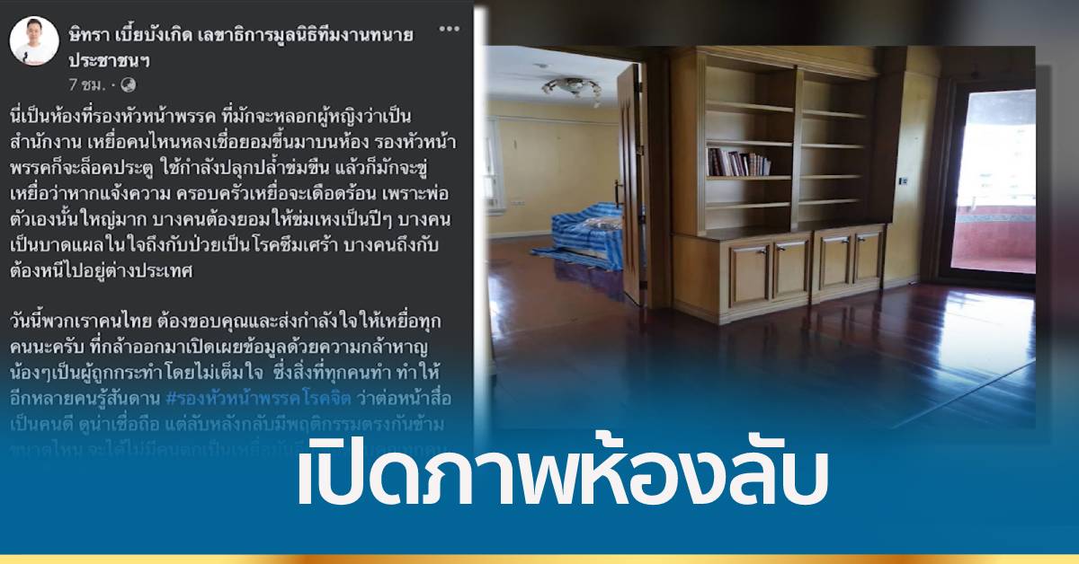 ภาพที่เห็นอยู่นี้เป็นภาพที่นายษิทรา เบี้ยบังเกิด หรือ ทนายตั้ม โพสต์ผ่านเฟซบุ๊ก พร้อมเขียนข้อความว่า “นี่เป็นห้องที่รองหัวหน้าพรรค ที่มักหลอกผู้หญิงว่าเป็นสำนักงาน เหยื่อคนไหนหลงเชื่อยอมขึ้นมาบนห้อง รองหัวหน้าพรรคก็จะล็อกประตู ใช้กำลังปลุกปล้ำข่มขืน แล้วก็มักจะขู่เหยื่อว่าหากแจ้งความ ครอบครัวเหยื่อจะเดือดร้อน เพราะพ่อตัวเองนั้นใหญ่มาก บางคนต้องยอมให้ข่มเหงเป็นปีๆ บางคนเป็นบาดแผลในใจถึงกับป่วยเป็นโรคซึมเศร้า บางคนถึงกับต้องหนีไปอยู่ต่างประเทศ
