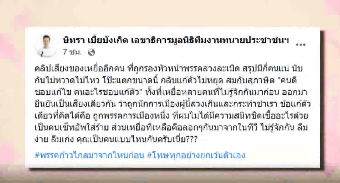 เมื่อคืนที่ผ่านมา นายษิทรา เบี้ยบังเกิด หรือ ทนายตั้ม โพสต์คลิปผ่านเฟซบุ๊ก พร้อมเขียนข้อความว่า “คลิปเสียงของเหยื่ออีกคน ที่ถูกรองหัวหน้าพรรคล่วงละเมิด สรุปมีกี่คนแน่ นับกันไม่หวาดไม่ไหว โป๊ะแตกขนาดนี้ กลับแก้ตัวไม่หยุด สมกับสุภาษิต “คนดีชอบแก้ไข คนอะไรชอบแก้ตัว” ทั้งที่เหยื่อหลายคนที่ไม่รู้จักกันมาก่อน ออกมายืนยันเป็นเสียงเดียวกัน ว่าถูกนักการเมืองผู้นี้ล่วงเกินและกระทำชำเรา ข้อแก้ตัวเดียวที่คิดได้คือ ถูกพรรคการเมืองหนี่ง ที่ผมไม่ได้มีความสนิทชิดเชื้ออะไรด้วยเป็นคนเซ็ตอัปใส่ร้าย ส่วนเหยื่อที่เหลือคือลอกๆ กันมาจากในทีวี ไม่รู้จักกัน ลืมง่าย ลืมเก่ง คุณเป็นคนแบบไหนกันครับเนี่ย??? #พรรคก้าวไกลมาจากไหนก่อน #โทษทุกอย่างยกเว้นตัวเอง”