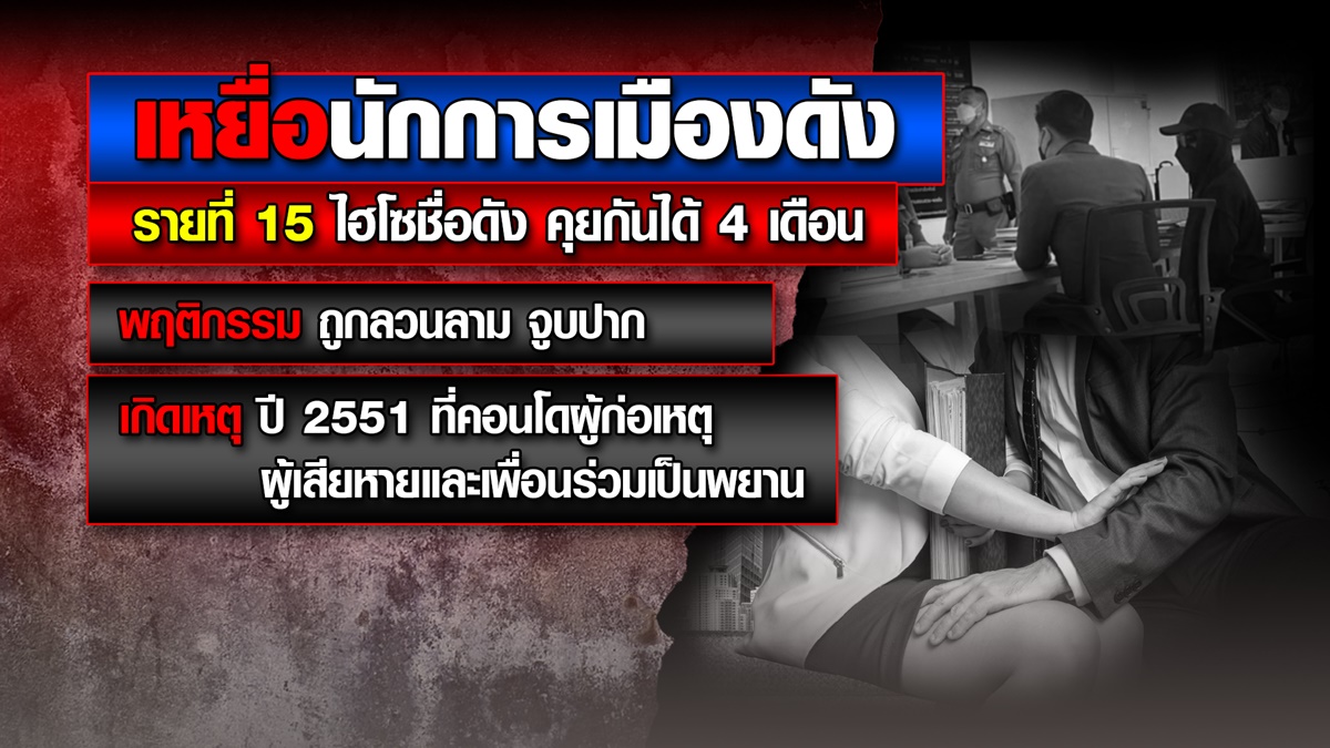 นายษิทรา เบี้ยบังเกิด เลขาธิการมูลนิธิทีมงานทนายประชาชนฯ เปิดเผยถึงผู้เสียหายรายที่ 15 ในคดีนักการเมืองล่วงละเมิดทางเพศ เป็นไฮโซ ติดต่อเข้ามาบอกว่า เคสตัวเองเกิดเมื่อปี 2551 รู้จักกันผ่านอินสตาแกรม 4-5 เดือน ก่อนจะโดนล่อลวงไปคอนโดฯ พร้อมเพื่อน แล้วมีการจูบลูบคลำ ไม่ได้ถูกข่มขืน เจ้าตัวได้ไปเป็นพยานในคดีแล้ว เชื่อว่าจะมีเหยื่อติดต่อเข้ามาอีก แม้จะมีคนที่ถูกข่มขืนถอนตัวไป 2 คดีก็ตาม ซึ่งมองว่า คดีนี้ยังไม่ส่งฟ้องเร็วๆ นี้ เจ้าหน้าที่ได้กันตัวผู้เสียหายไว้เป็นพยาน 3 คน จาก 12 คน ส่วนตัวยอมรับกังวลว่าจะมีคนแฝงตัวมาเป็นผู้เสียหาย ทำให้ดูเป็นเกมการเมือง จนทำให้เหยื่อทั้งหมดดูเป็นการสร้างเรื่องขึ้นมา จากนี้มีใครติดต่อมาต้องระวังมากขึ้น