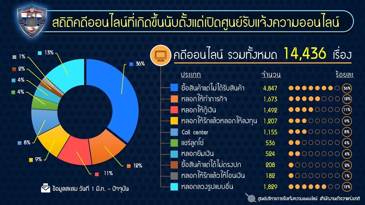 รอง ผบ.ตร. กล่าวอีกว่า ตั้งแต่เปิดศูนย์รับแจ้งความออนไลน์ ตร. เมื่อวันที่ 1 มี.ค. เป็นต้นมา มียอดผู้เสียหายแจ้งความคดีออนไลน์แล้ว 14,436 เรื่อง แบ่งเป็นคดีที่รับแจ้งมากที่สุด 9 อันดับ ได้แก่
