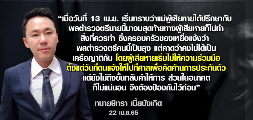 มีข้อมูลเริ่มทราบว่าเมื่อวันที่ 13 เมษายนที่ผ่านมา แม่ผู้เสียหายได้ปรึกษากับ พลตำรวจตรีนายนี้มาตลอด ครอบครัวของเหยื่อแจ้งว่า พลตำรวจตรีคนนี้เป็นลุง แต่คาดว่าคงไม่ได้เป็นเครือญาติกัน โดยผู้เสียหายเริ่มไม่ให้ความร่วมมือตั้งแต่วันที่ตนแจ้งให้ไปที่ศาลเพื่อคัดค้านการประกันตัว แต่ยังไม่ถึงขั้นกลับคำให้การ ส่วนในอนาคตก็ไม่แน่นอน จึงต้องป้องกันไว้ก่อน คาดว่าตั้งแต่วันเกิดเหตุ ผู้เสียหายก็คงได้ประสานกับพลตำรวจตรีนายนี้แล้ว ก่อนหน้าที่ผู้เสียหายมาปรึกษาตนก็ยังไม่มีใครบอกให้เหยื่อไปแจ้งความแต่อย่างใด ตอนนี้กังวลว่าเมื่อคดีไปถึงชั้นอัยการที่อาจต้องมีการสอบปากคำเพื่อเติม ผู้เสียหายอาจให้การที่ไม่เป็นประโยชน์กับรูปคดี