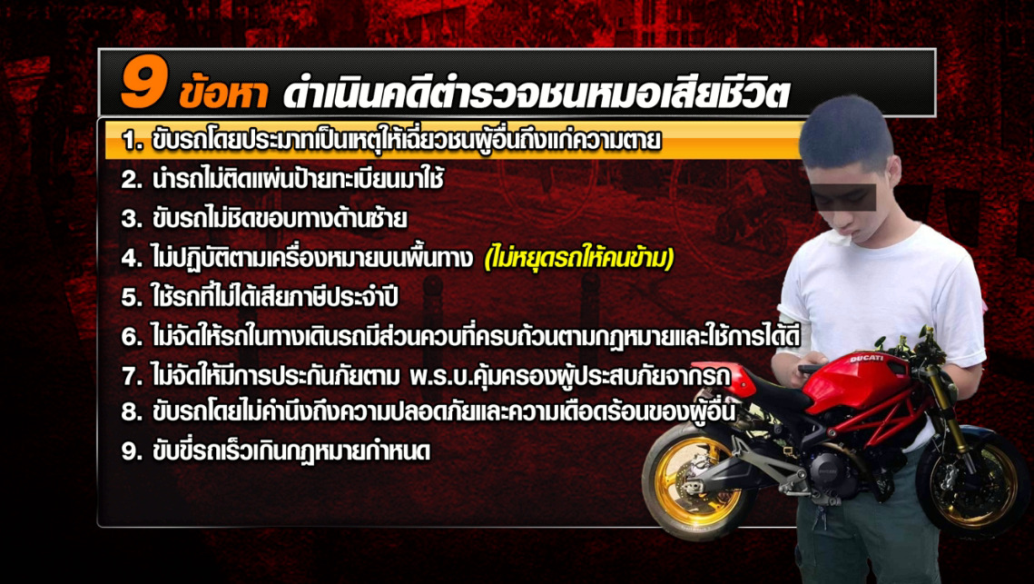 นอกจากนี้ สำนักงานอัยการ ยังมีคำขอให้ริบรถจักรยานยนต์ที่ พนักงานสอบสวนยึดไว้เป็นของกลาง และมีคำขอให้ศาลเพิกถอน หรือพักใช้ใบอนุญาตขับขี่ของผู้ต้องหาด้วย โดยการริบหรือพักใช้ใบอนุญาตขับขี่ขึ้นอยู่กับดุลพินิจของศาลว่าจะให้พักใช้เป็นระยะเวลากี่ปี ซึ่งศาลได้สอบคำให้การ ส.ต.ต.นรวิชญ์ จำเลย โดยอ่านและอธิบายฟ้องแล้วสอบถามว่าจะให้การรับสารภาพหรือปฏิเสธ ซึ่ง ส.ต ต.นรวิชญ์ แถลงให้การรับสารภาพ ไม่ต่อสู้คดี ศาลจึงมีคำสั่งให้พนักงานคุมประพฤติ สืบเสาะประวัติการศึกษา สถานะทางครอบครัว และอื่นๆ ของ ส.ต.ต.นรวิชญ์ แล้วรายงานให้ศาลทราบ เพื่อใช้ประกอบการพิจารณา โดยนัดฟังคำพิพากษาวันที่พรุ่งนี้ (25 เม.ย.) เวลา 09.00 น.-สำนักข่าวไทย