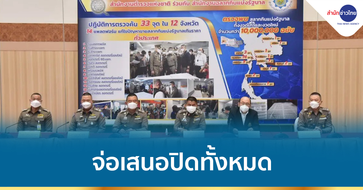 สตช. 27 เม.ย.- สำนักงานตำรวจแห่งชาติ และสำนักงานกินแบ่งรัฐบาล ร่วมแถลงผลตรวจค้นเป้าหมายแพลตฟอร์มจำหน่ายสลากออนไลน์เกินราคาทุกแห่งทั่วประเทศ พบสลากรวมกว่า 10 ล้านฉบับ ชี้บริษัทมังกรฟ้า มีโครงสร้างและเครือข่ายซับซ้อนที่สุด เบื้องต้นเตรียมเสนอหลักฐานปิดทุกแพลตฟอร์มต่อไป