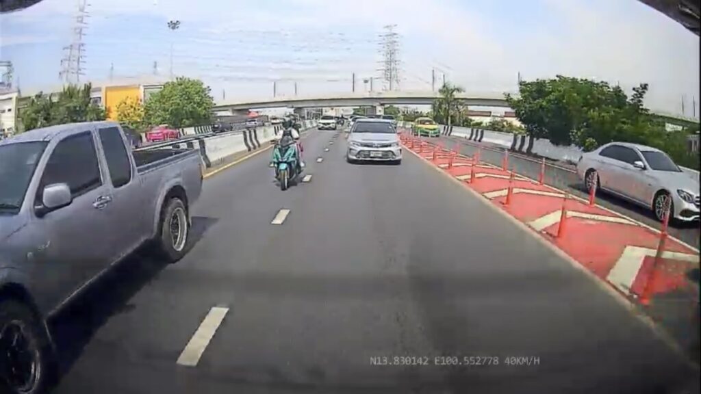 สำหรับรถจักรยานยนต์ของผู้เสียชีวิตนั้น ถูกนำมาเก็บไว้ที่ สน.ประชาชื่น พบว่าเป็นจักรยานยนต์ยี่ห้อ Yamaha Aerox โดยภาพจากกล้องหน้ารถจับภาพได้ว่าขับขี่มาในช่องทางด้านขวา ตามรถกระบะอีซูซุสีเทามา จากนั้นเร่งความเร็วและแซงขึ้นมาทางด้านซ้ายของรถกระบะ ก่อนที่จะปรากฏภาพรถจักรยานยนต์กระเด็นมากลางถนน และเห็นคนขับขี่กระเด็นร่วงลงไปเกาะอยู่ที่ขอบแบริเออร์