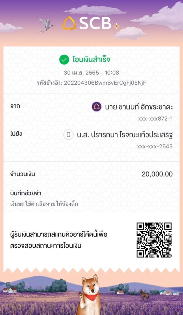 ล่าสุดทาง เพจ drama addict ได้โพสต์ แสดงความดีใจกับผู้เสียหาย พร้อมโชว์สลิปการโอนเงิน ให้ผู้เสียหายแล้วจำนวน 30,000 บาท โดยมีการโอนผ่านบัญชีของผู้จัดการส่วนตัวของ ขุน ชานนท์ รวมสองครั้ง ครั้งแรก เวลา 10.08 น. จำนวน 20,000 บาทและครั้งที่สอง เวลา 10.13 น. อีก 10,000 บาท.-สำนักข่าวไทย