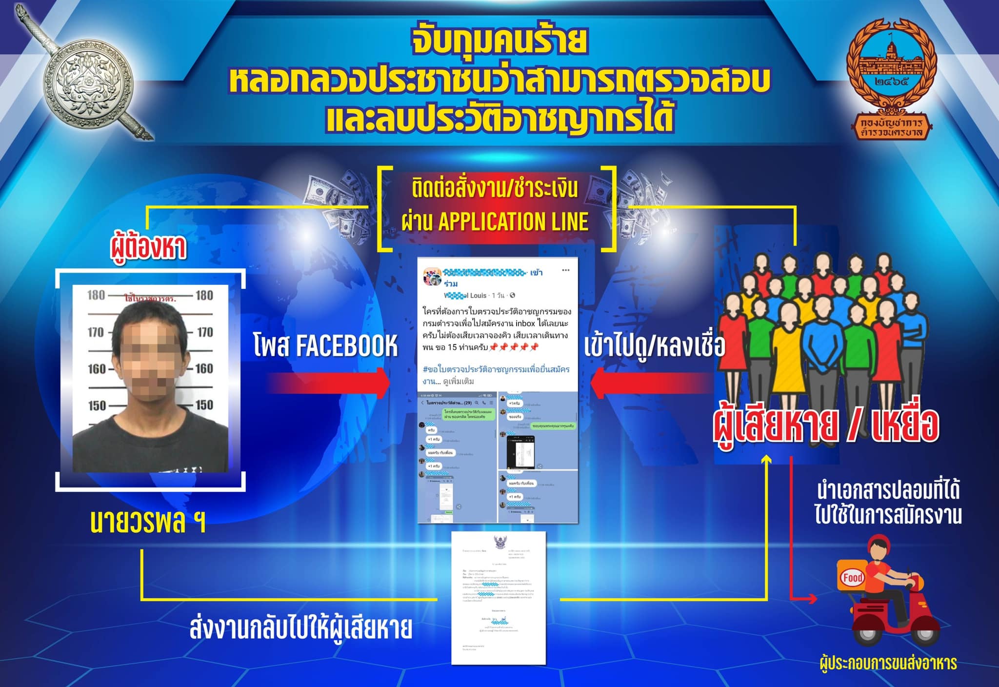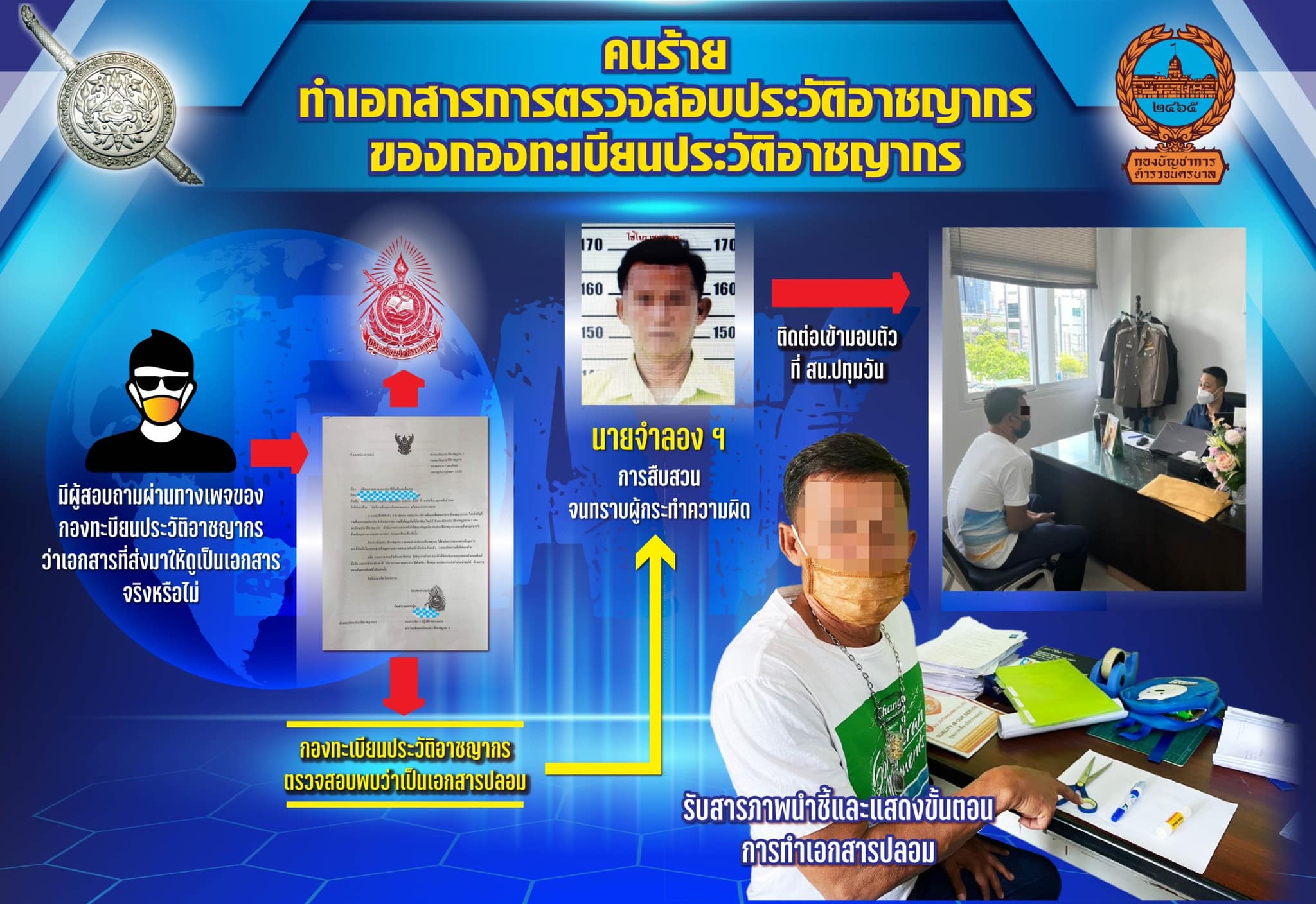 ขณะเดียวกัน ผู้ช่วยผู้บัญชาการตำรวจแห่งชาติ ยังแถลงผลการดำเนินคดีกับผู้ต้องหาปลอมเอกสารตรวจสอบประวัติอาชญากร 2 ราย คดีแรก จับกุม นายวรพล ทรงสละบุญ ซึ่งโพสต์ข้อความผ่านเฟซบุ๊กกลุ่มไรเดอร์ต่างๆ ว่าสามารถตรวจสอบ ลบข้อมูลประวัติอาชญากรรมของสำนักงานตำรวจแห่งชาติได้ โดยคิดค่าบริการรายละ 200-2,000 บาท แต่พบว่าเอกสารที่ผู้ต้องหาทำขึ้น เป็นเอกสารปลอม และไม่มีการลบประวัติอาชญากรรมตามที่กล่าวอ้าง อีกคดีจับกุมนายจำลอง ยิ่งตระกูล พนักงานชั่วคราวของบริษัทรักษาความปลอดภัยแห่งหนึ่ง ซึ่งมีพฤติกรรมลักษณะเดียวกัน.-สำนักข่าวไทย