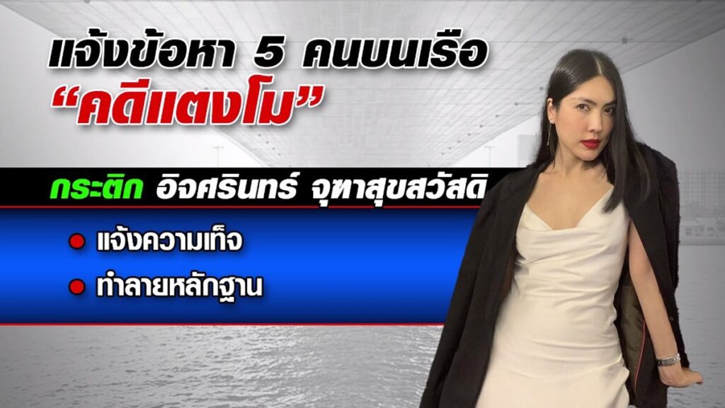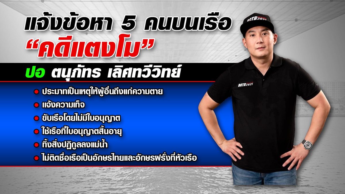 - นายตนุภัทร เลิศทวีวิทย์ (ปอ) ผู้ต้องหาที่ 1 มี 6 ข้อหา ได้แก่ ประมาทจนเป็นเหตุให้มีผู้เสียชีวิต, เป็นผู้ควบคุมเรือโดยไม่มีประกาศนียบัตร, ให้การเท็จต่อเจ้าพนักงาน, ทิ้งสิ่งของปฏิกูลลงในแม่น้ำลำคลอง, ไม่ติดชื่อเรือบนหัวเรือ, ร่วมกันใช้เรือที่หมดอายุการใช้งานตามใบอนุญาตแล้ว ซึ่งข้อหาใช้เรือที่ไม่มีชื่อบนหัวเรือ และข้อหาร่วมกันใช้เรือที่ใบอนุญาตหมดอายุ พนักงานสอบสวนได้พิจารณาปรับตามโทษแล้ว