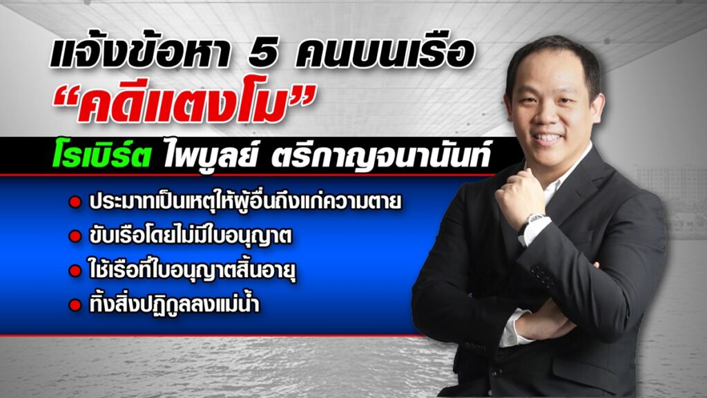 - นายไพบูลย์ ศรีกาญจนานันท์ (โรเบิร์ต) ผู้ต้องหาที่ 2 มี 4 ข้อหา ได้แก่ ประมาทจนเป็นเหตุให้มีผู้เสียชีวิต, เป็นผู้ควบคุมเรือโดยไม่มีประกาศนียบัตร, ใช้เรือที่ใบอนุญาตสิ้นอายุแล้ว และทิ้งสิ่งของปฏิกูลลงในแม่น้ำลำคลอง
