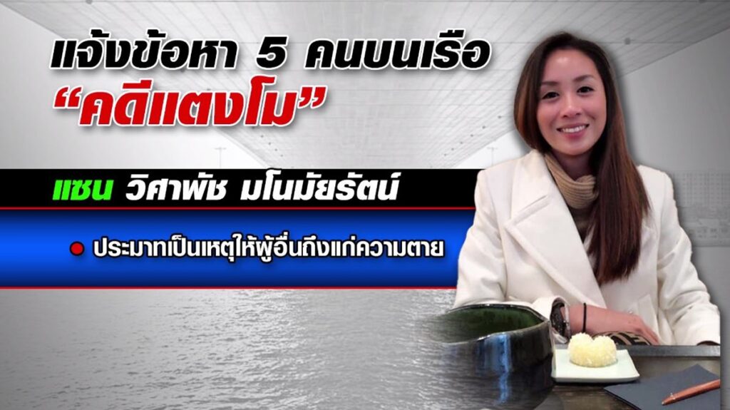 - นายวิศาพัช มโนมัยรัตน์ (แซน) ผู้ต้องหาที่ 3 มี 1 ข้อหา ได้แก่ ประมาทเป็นเหตุให้ผู้อื่นถึงแก่ความตาย