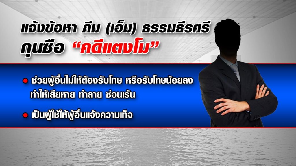 และ 6. นายภีม ธรรมธีรศรี (เอ็ม) ผู้ต้องหาที่ 6 มี 2 ข้อหา ได้แก่ ทำลายหลักฐานในการกระทำผิด และใช้ให้ผู้อื่นแจ้งข้อความอันเป็นเท็จ